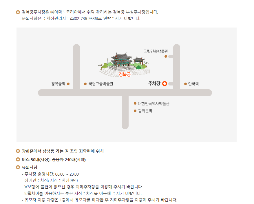 경복궁 주차장은 버스 50대와 승용차 240대를 이용할 수 있습니다. 하지만 주말에는 턱없이 부족한 공간이기에 사실상 이용하기가 힘들 것이라 생각이 듭니다. 그래서 먼저 주차장 관리사무소 02-736-9536에 문의를 하시고 공간이 없으면 주변 주차장을 이용하시면 됩니다.