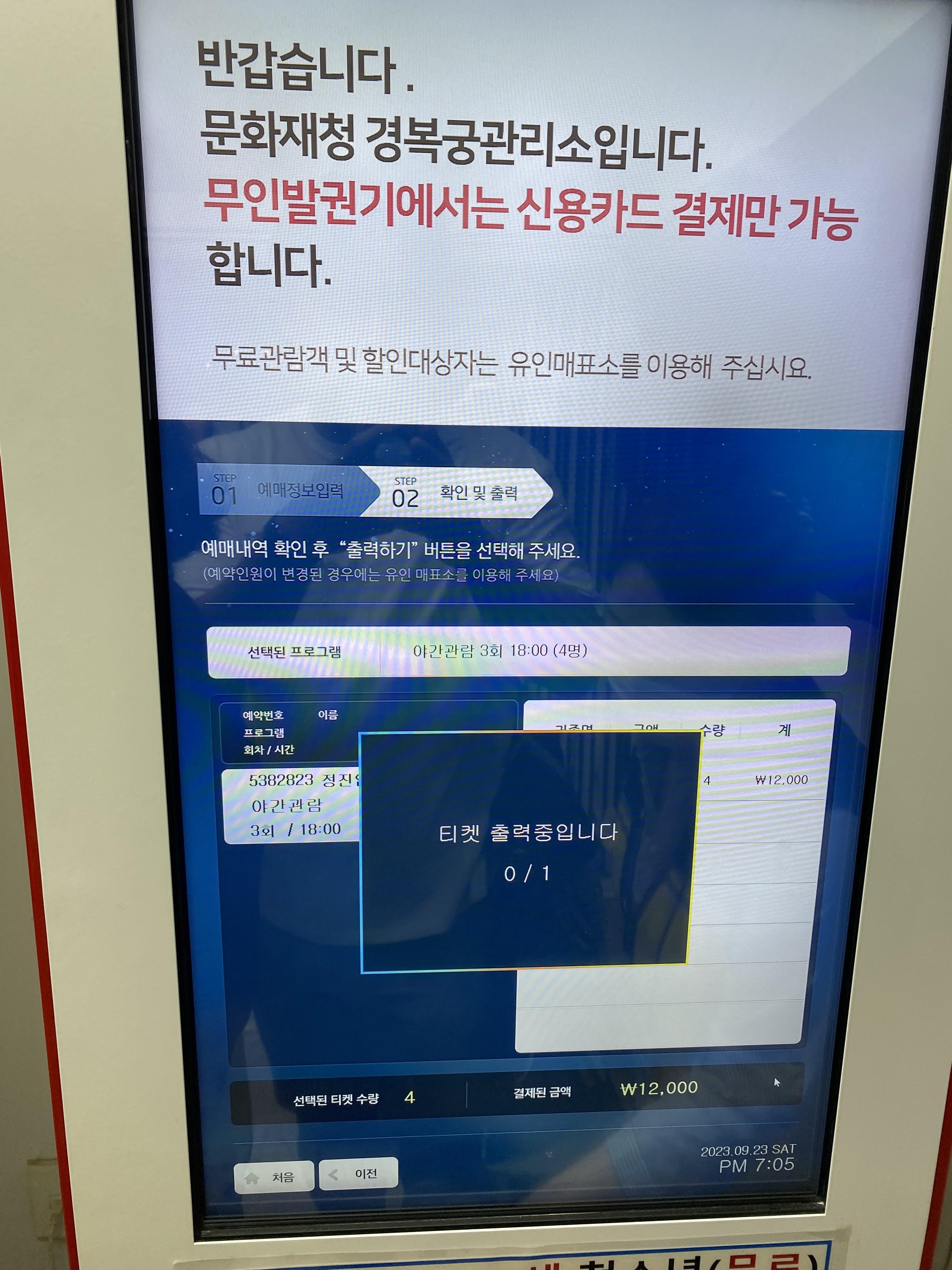 경복궁을 입장하시면 티켓 현장 수령처가 있습니다. 참고로 티켓을 4개 예매했으면 한 장 두 장 따로 티켓을 수령할 수 있는 게 아니고 4명이 동시에 입장할 수 있는 티켓 1장이 출력됩니다.