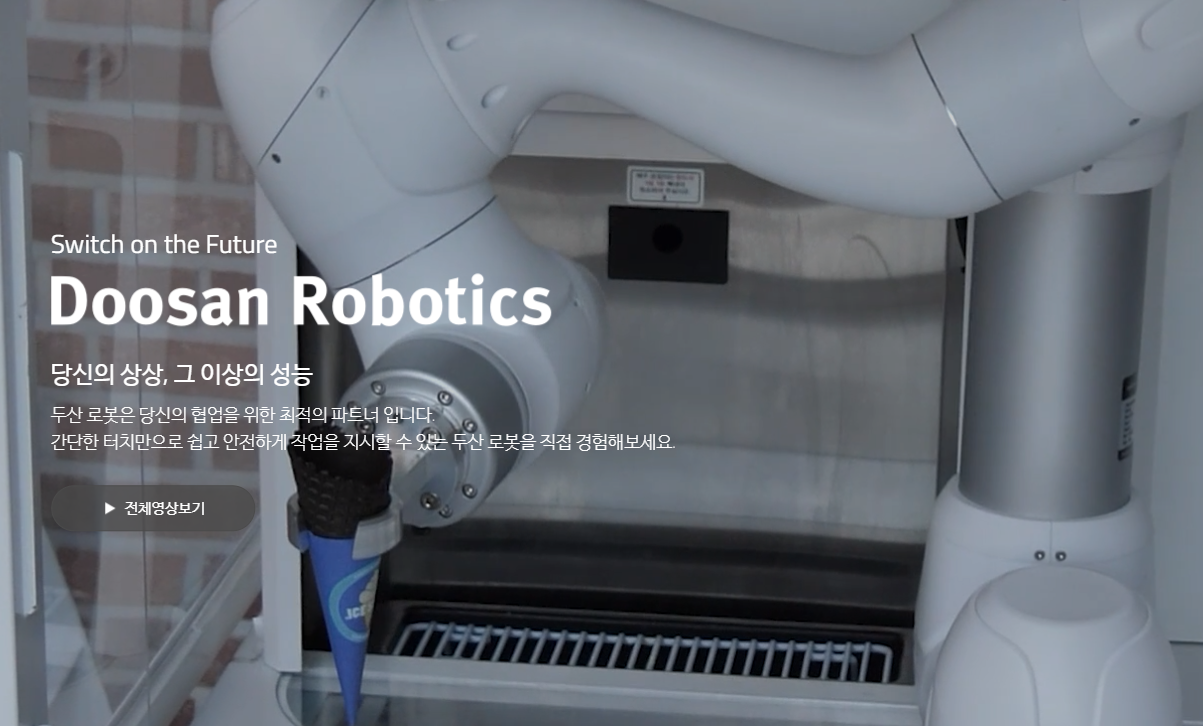 두산로보틱스는 로봇 부문 중 협동 로봇을 만드는 회사입니다. 협동 로봇이란 우리가 흔히 알고 있는 자영업, 공장 등 일터에서 사람과 함게 일하는 로봇을 뜻하며, 대부분의 협동로복은 팔 형태를 가지고 있습니다. 치킨가게에서 흔히 볼 수 있는 협동로봇을 제작하고 있는 회사가 두산로보틱스입니다.