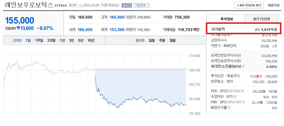 공모가 기준으로 두산로보틱스의 시가총액은 1조6853억입니다. 이는 현재 로복 대장주로 알려진 레인보우로보틱스의 절반도 안 되는 시가총액입니다