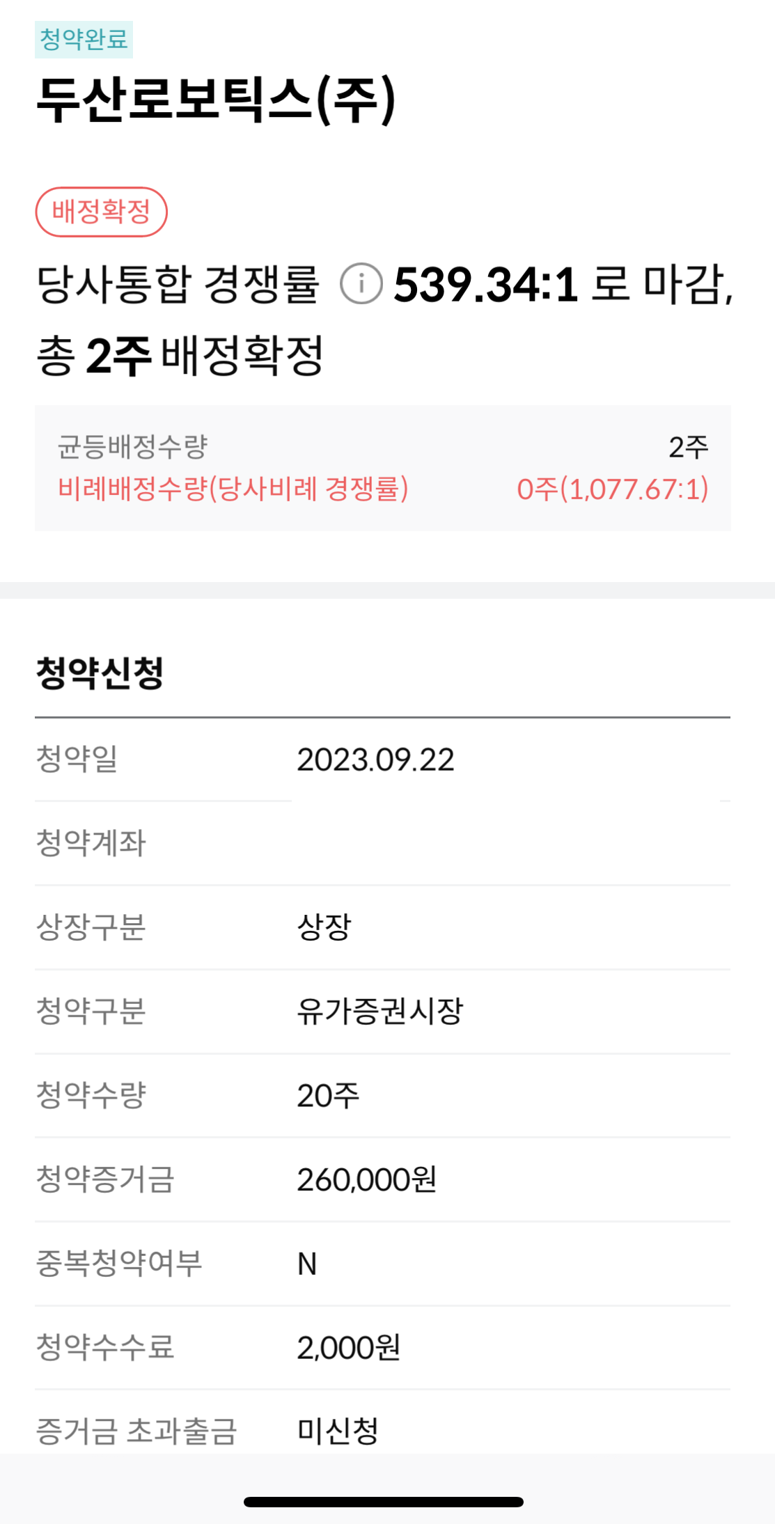 하지만 저는 한국투자증권으로 공모청약을 해서 2주를 받았습니다.