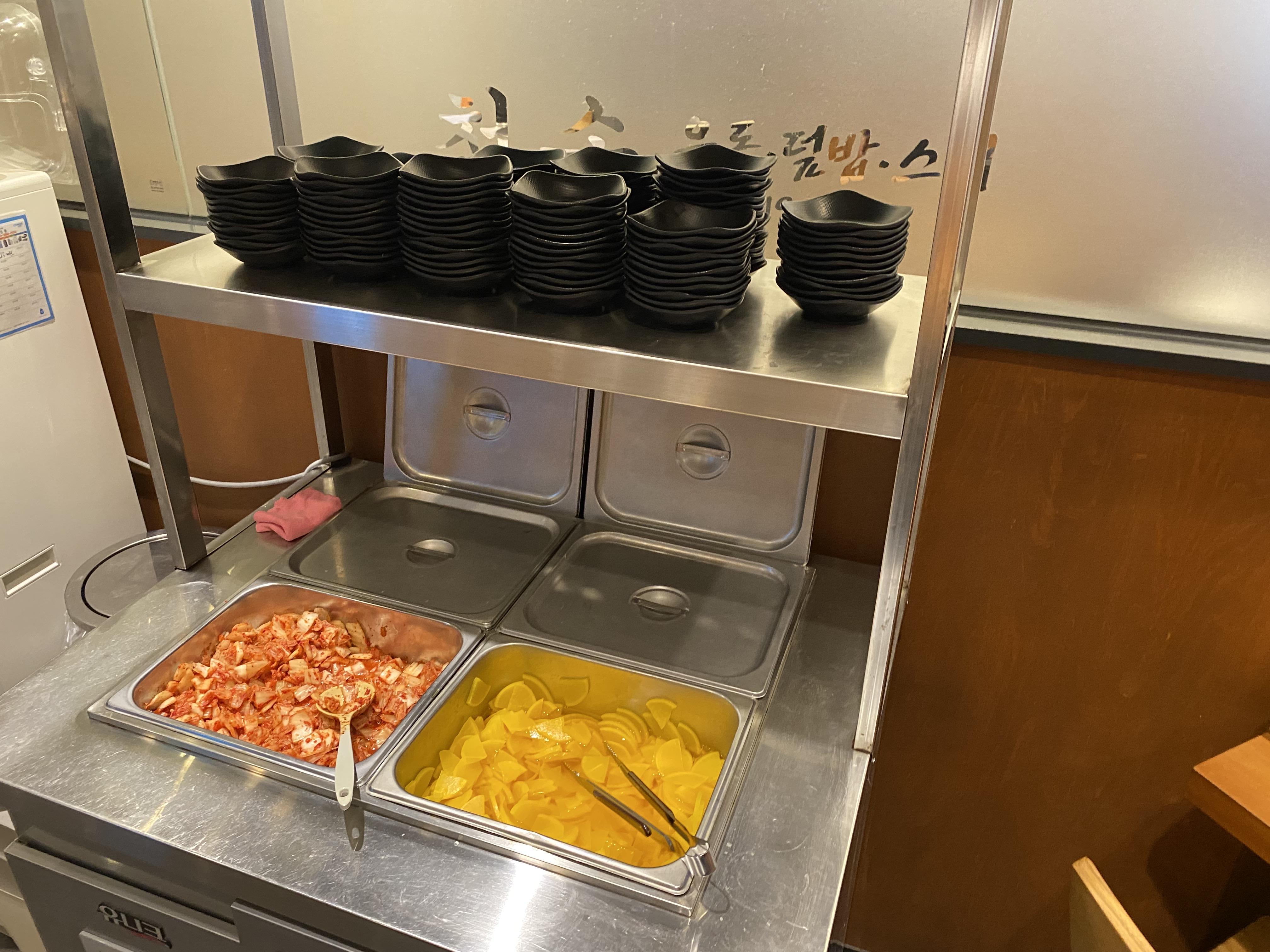 물 하고 반찬은 셀프시스템입니다. 반찬은 김치와 단무지가 있고 종기그릇이 있습니다.