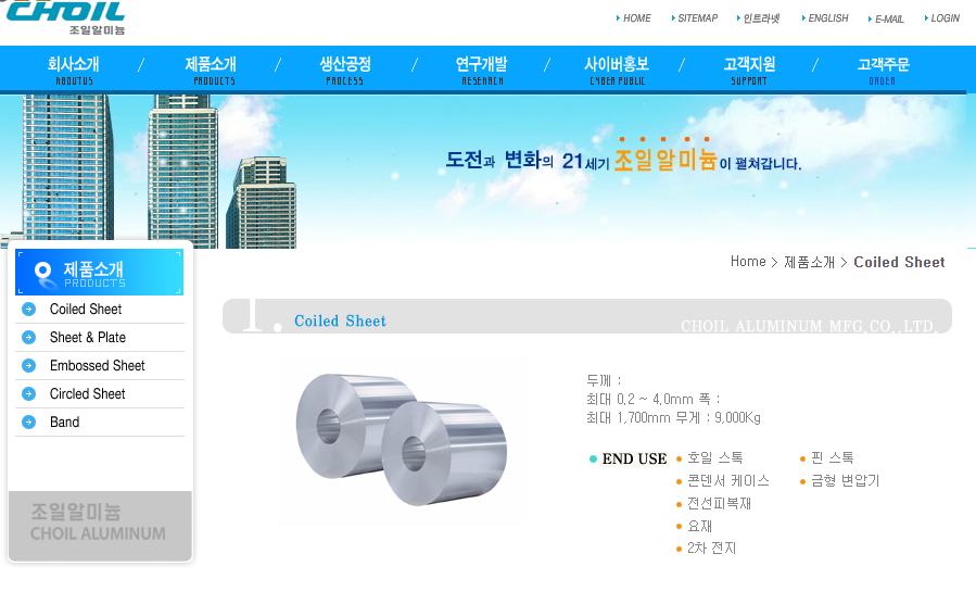 조일알미늄은 1975년 2월 설립이 되었으며, 폭 1,750mm의 광폭 압연제품을 생산하여,