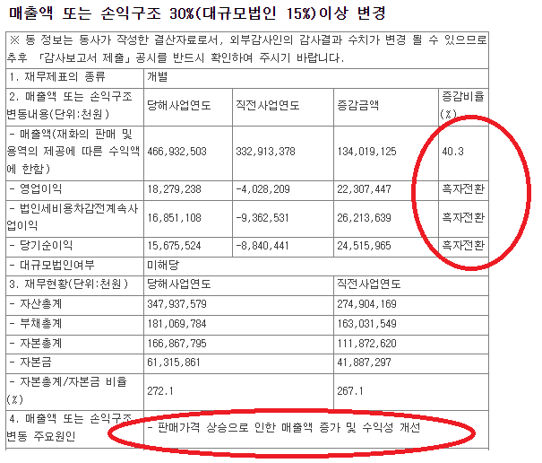 주요 원인으로는 판매 가격 상승으로 인한 매출액 증가 및 수익성 개선으로