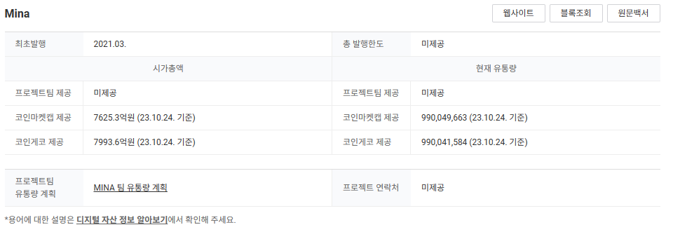 미나의 최초 발행은 2021년 3월이며 코인마켓캡 제공으로 시가총액은 7620억정도입니다. 낮은 시총은 아닙니다.