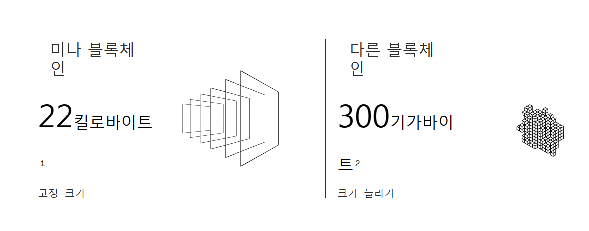 미나는 ZK0SNARK 증명을 통하여 블록체인의 데이터 규모를 일정하게 유지하고 있습니다. 이를 통해서 미나는 낮은 성능의 하드웨어로도 노드를 운영할 수 있는 게하여 탈중앙성을 높이는 특징을 가지고 있습니다.