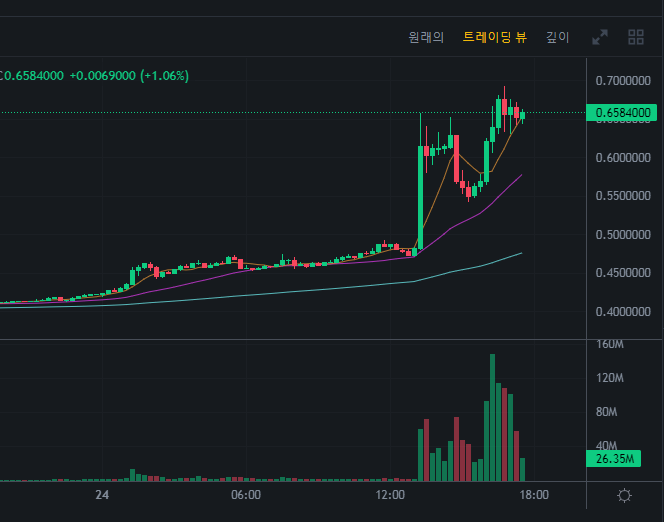 15분 봉 차트를 보시면 아직 제대로 된 상승파동이 안 나온 걸 알 수 있습니다. 현재 거래대금과 함께 펀비를 올리고 있는 걸로 봐서 시장만 받쳐준다면 상승세를 탈 수 있을 거라 생각이 듭니다.