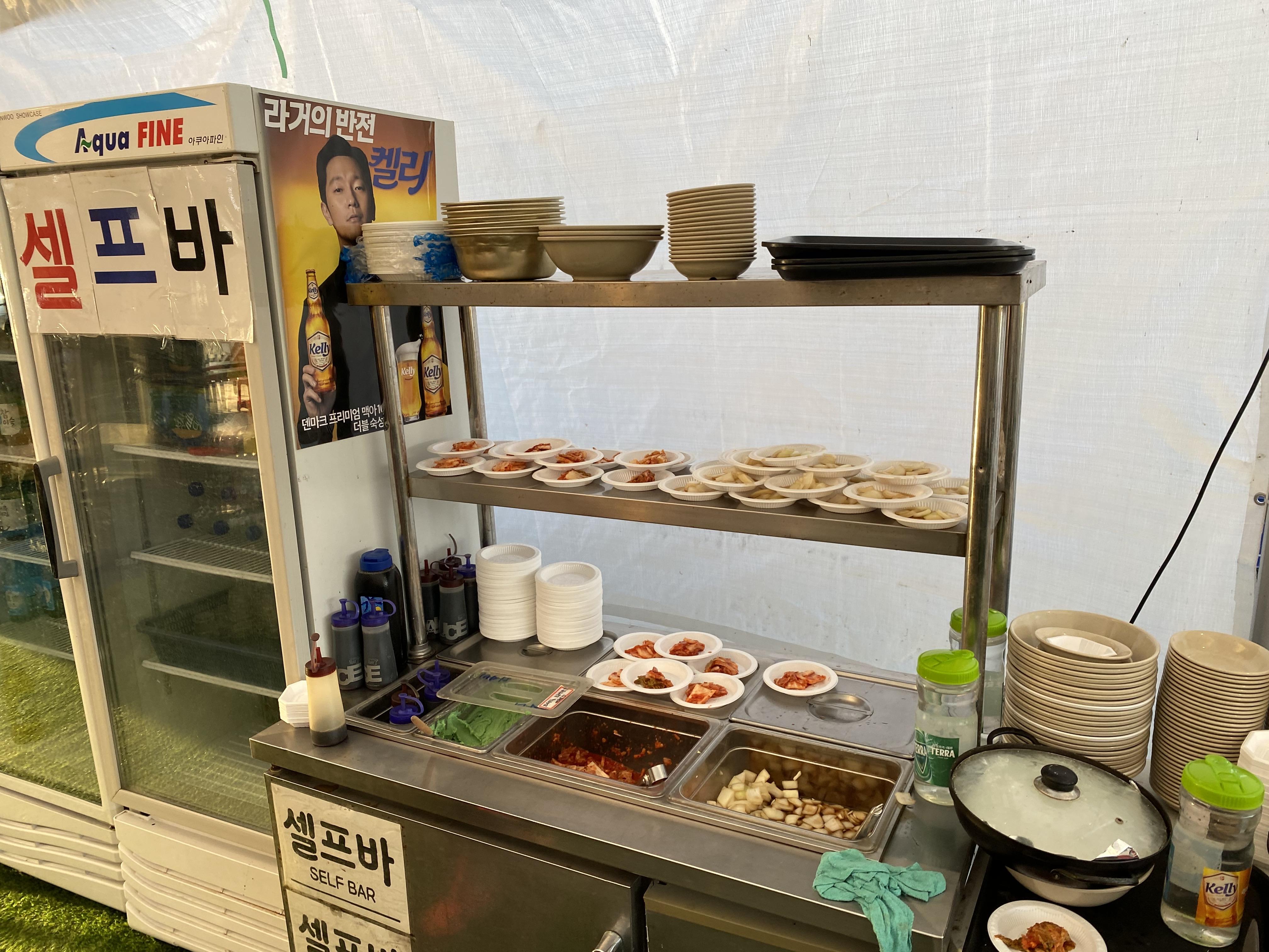 셀프바에는 물, 접시, 소스 등등 구비가 되어 있습니다.
