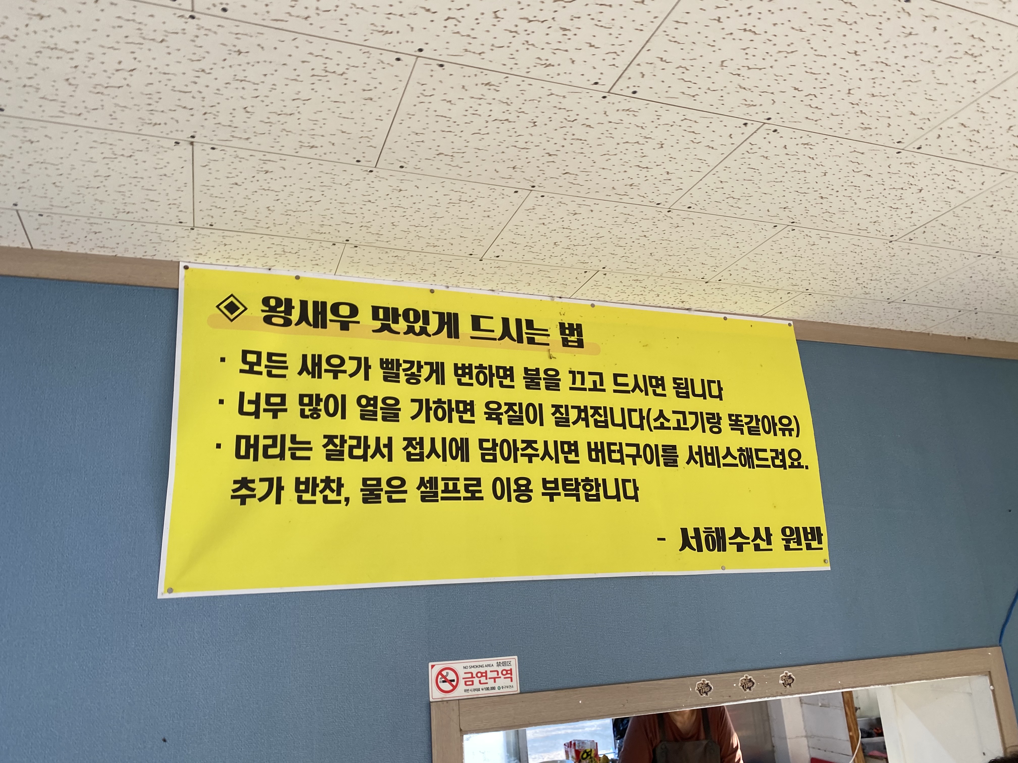 서해수산 메뉴는 단순하게 새우음식만 있습니다. 왕새우구이와 포장, 간장새우, 왕새우튀김, 해물라면이 있습니다.