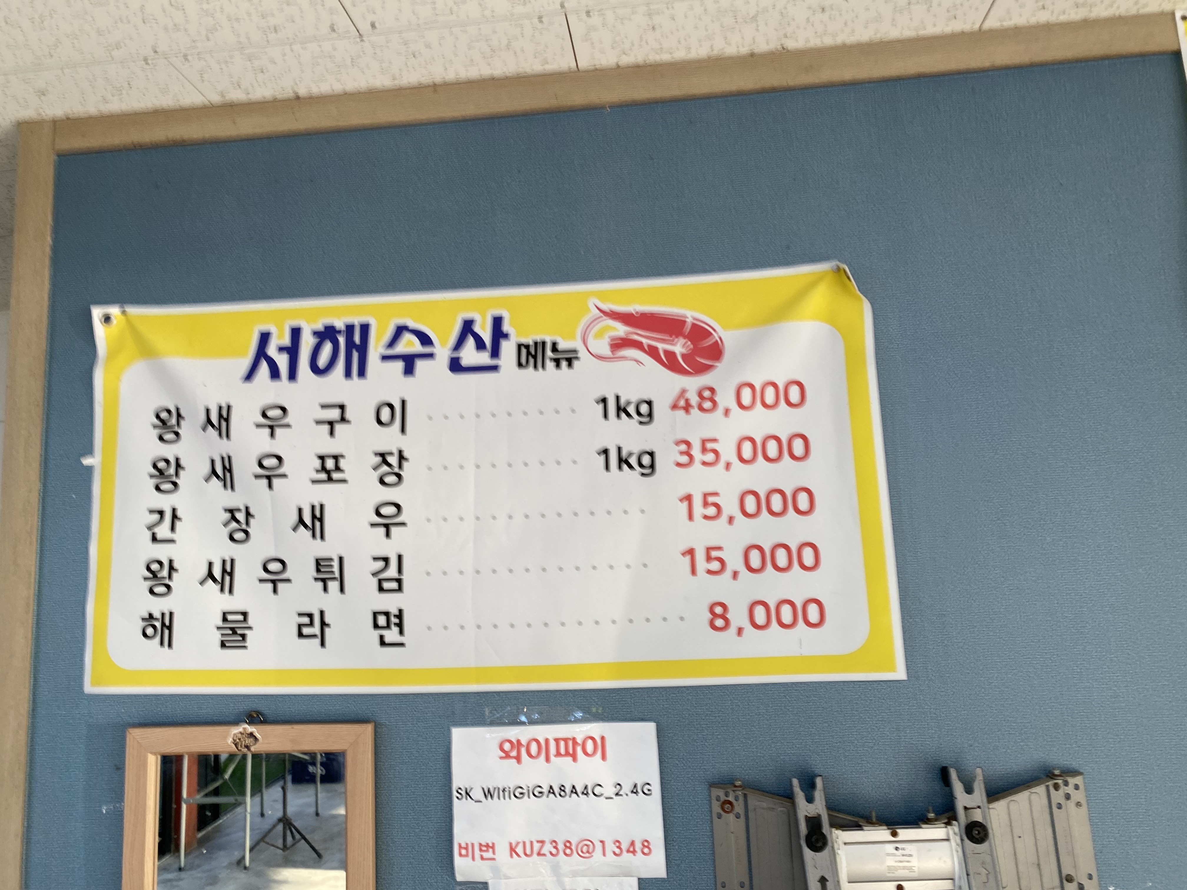 서해수산 메뉴는 단순하게 새우음식만 있습니다. 왕새우구이와 포장, 간장새우, 왕새우튀김, 해물라면이 있습니다.