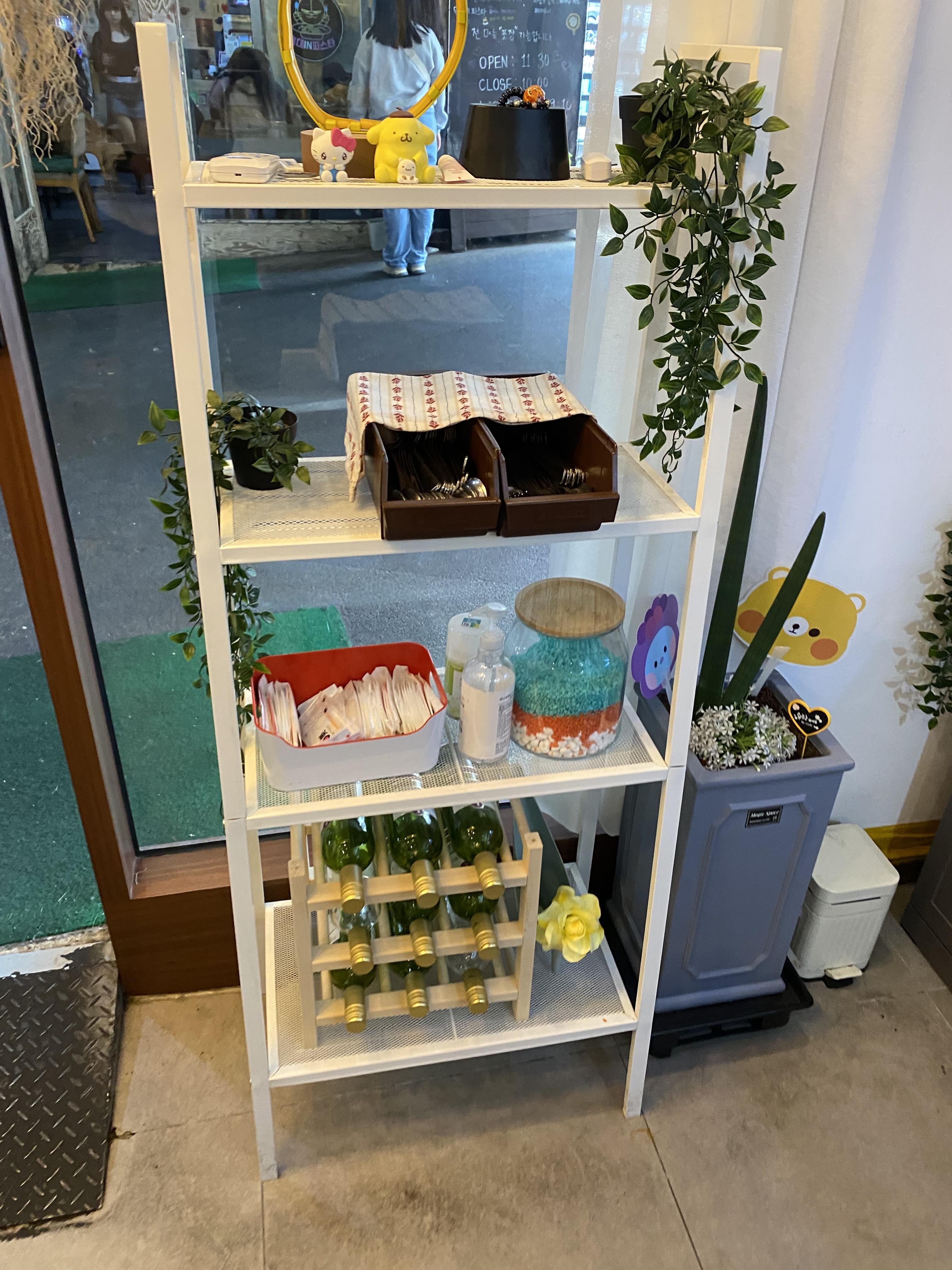 셀프바에는 물과 피클, 컵과 접시들이 마련되어 있습니다. 그리고 수저와 물티슈, 앞치마, 담요 등도 마련되어 있습니다.