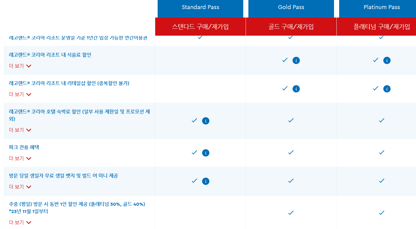 연간이용권 구간별 혜택 표입니다. 확실히 레고랜드 내에서 혜택을 받을 수 있는 것들이 많이 있습니다.
