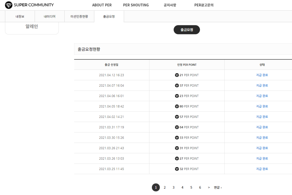 마이페이지에 출금요청을 누르면 지급받은 PER를 개인지갑에 출금을 할 수 있습니다.