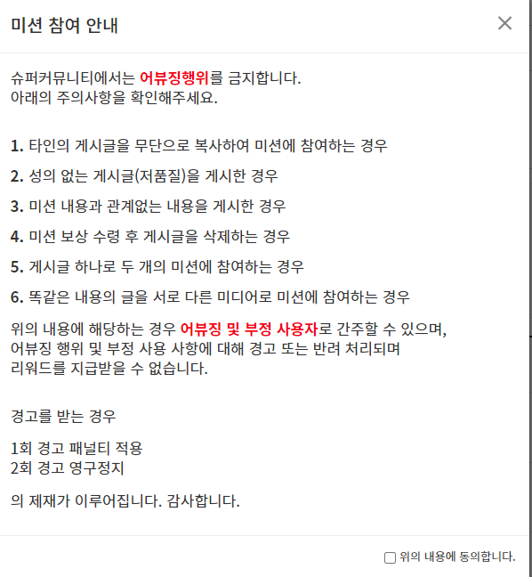 그러면 미션에 대한 주의사항 팝업이 뜨고 동의를 클릭하면 됩니다.