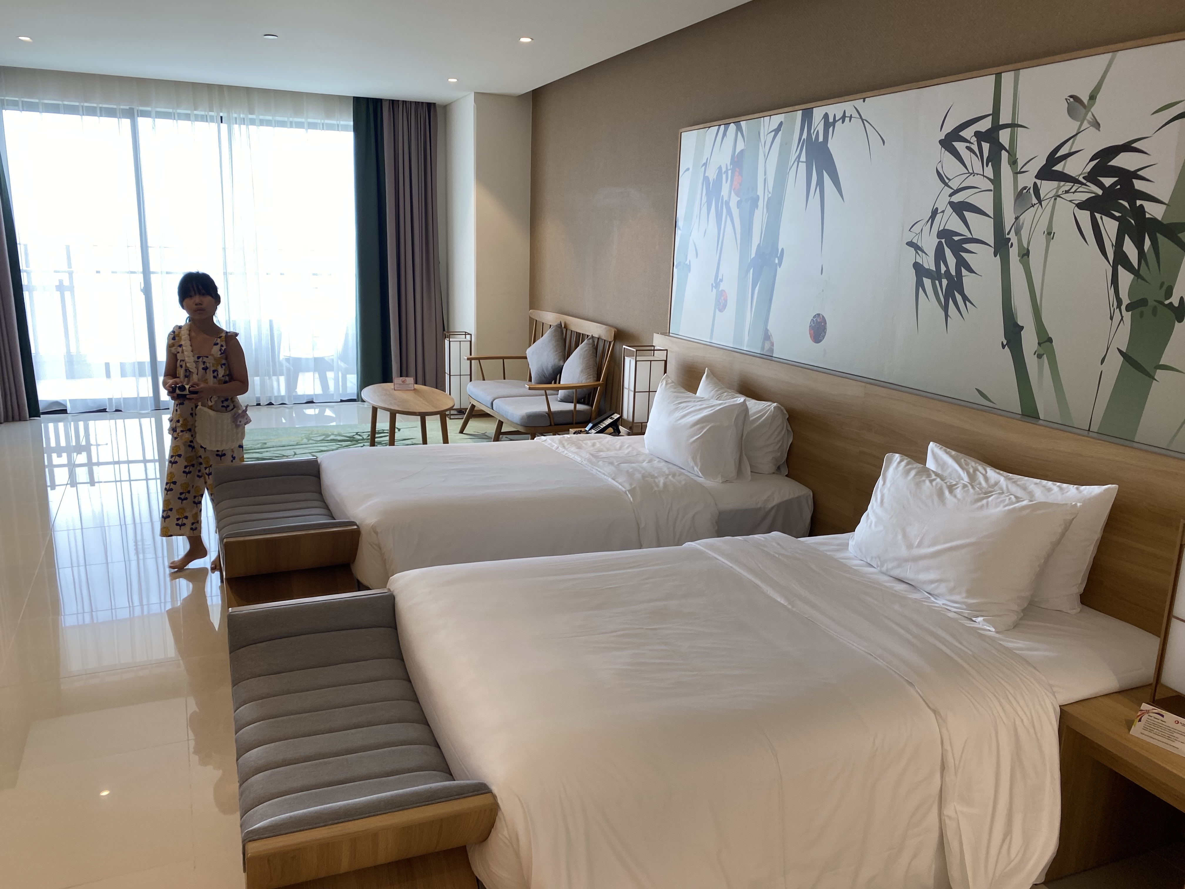 디럭스 스위트룸 오션뷰는 싱글베드 2개, 비데, 욕조, 테라스, 우산, 옥실용품, 금고 등이 제공됩니다. 확실히 넓고 깔끔해서 서 너무 좋습니다. 아이가 침대에서 떨어지기 걱정되면 침대를 붙여서 주무셔도 됩니다.