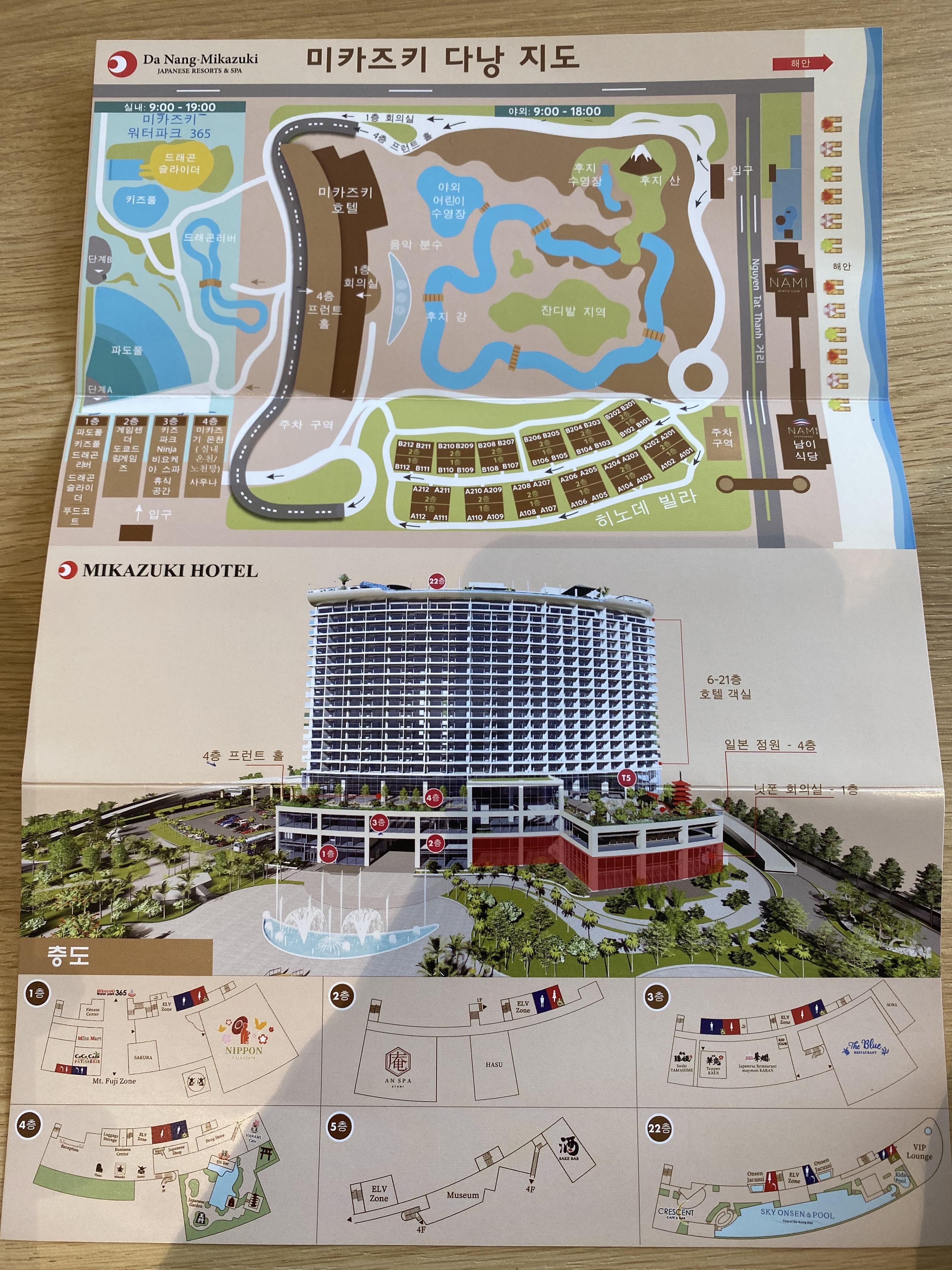 미카즈키 리조트는 총 21층 리조트로서 1층 회의실, 2층 스파, 3층 식당, 4층 프론트. 5층 미술관, 6~21층 객실로 구성되어 있습니다.