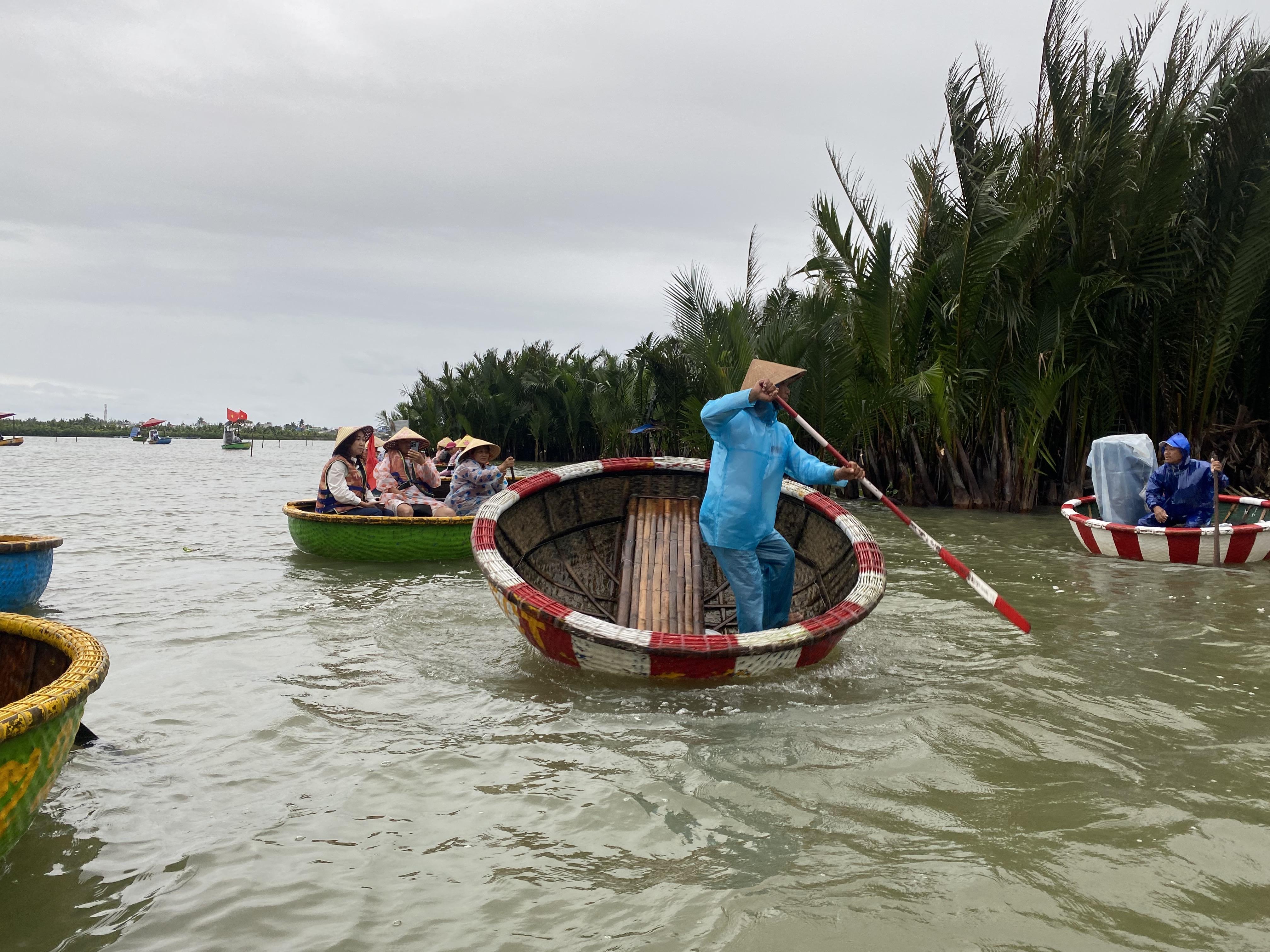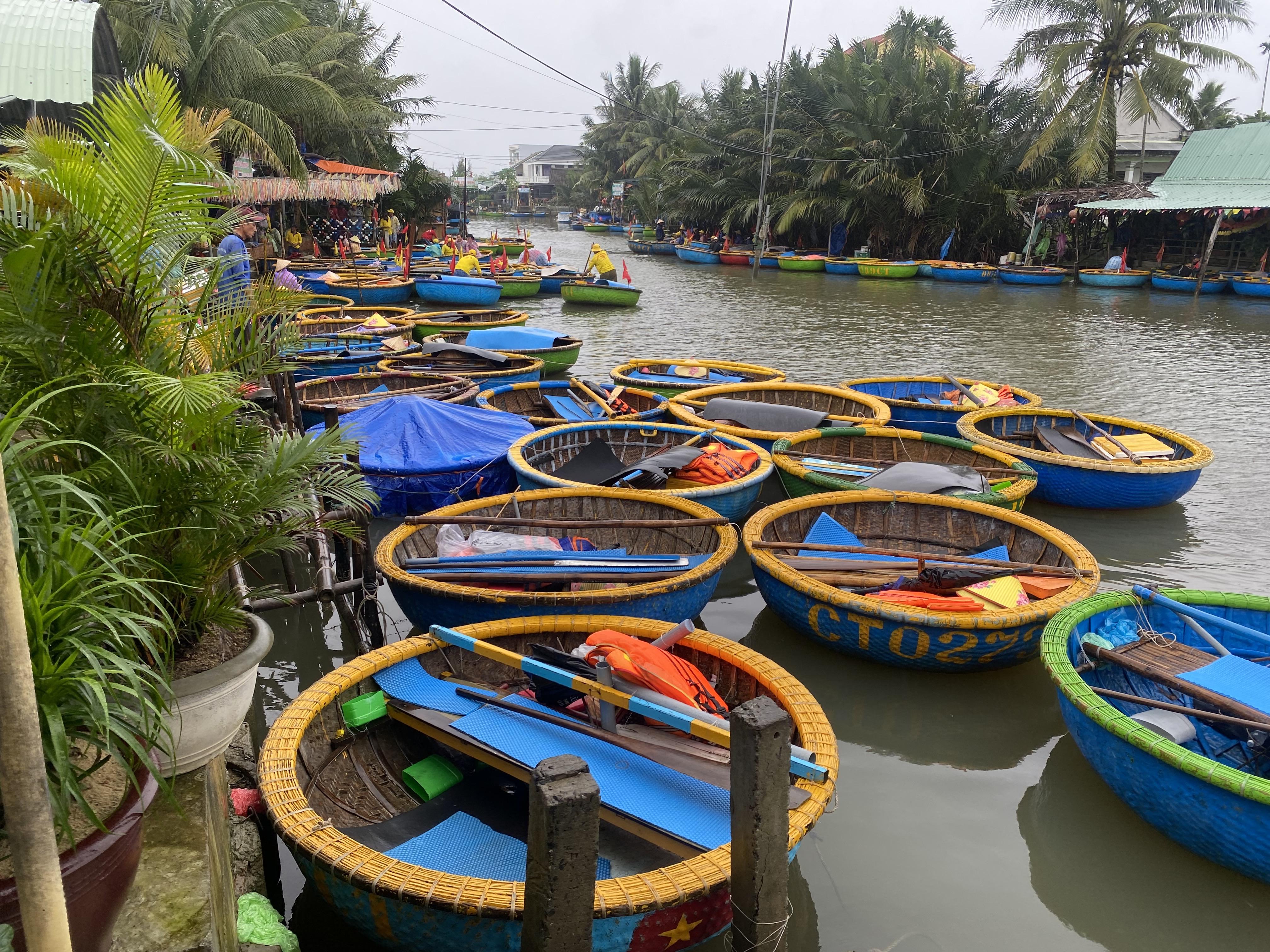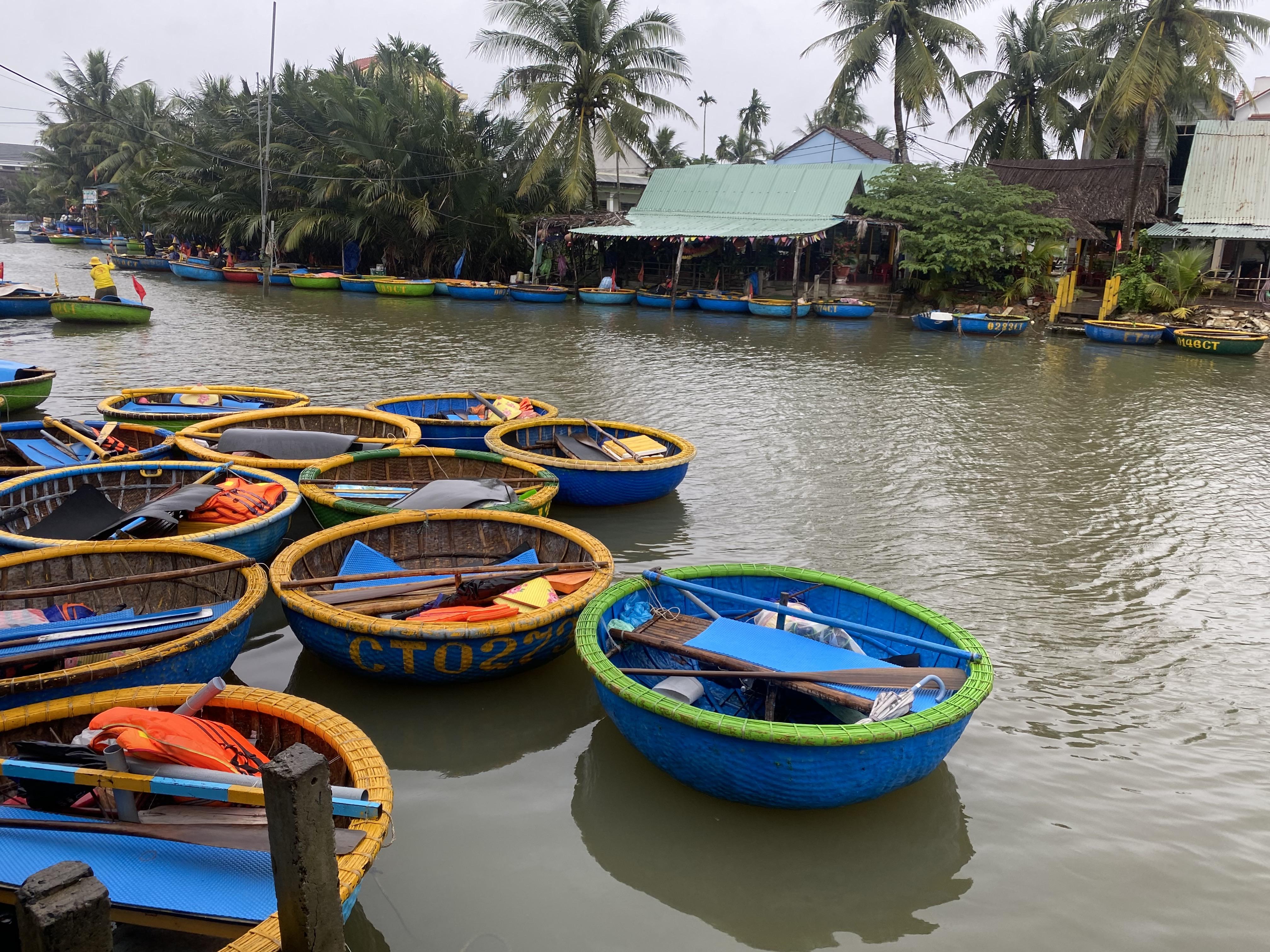 바구니배를 체험하러 온 관광객들이 많아서 업체들이 굉장히 많습니다. 바구니배는 바구니 모양을 닮아서 불리고 있는 베트남 전통 보트입니다. 코코넛 나무로 만들어서 튼튼합니다. 제가 몸무게가 많이 나가는대도 불구하고 잘 떠다니더라구요.