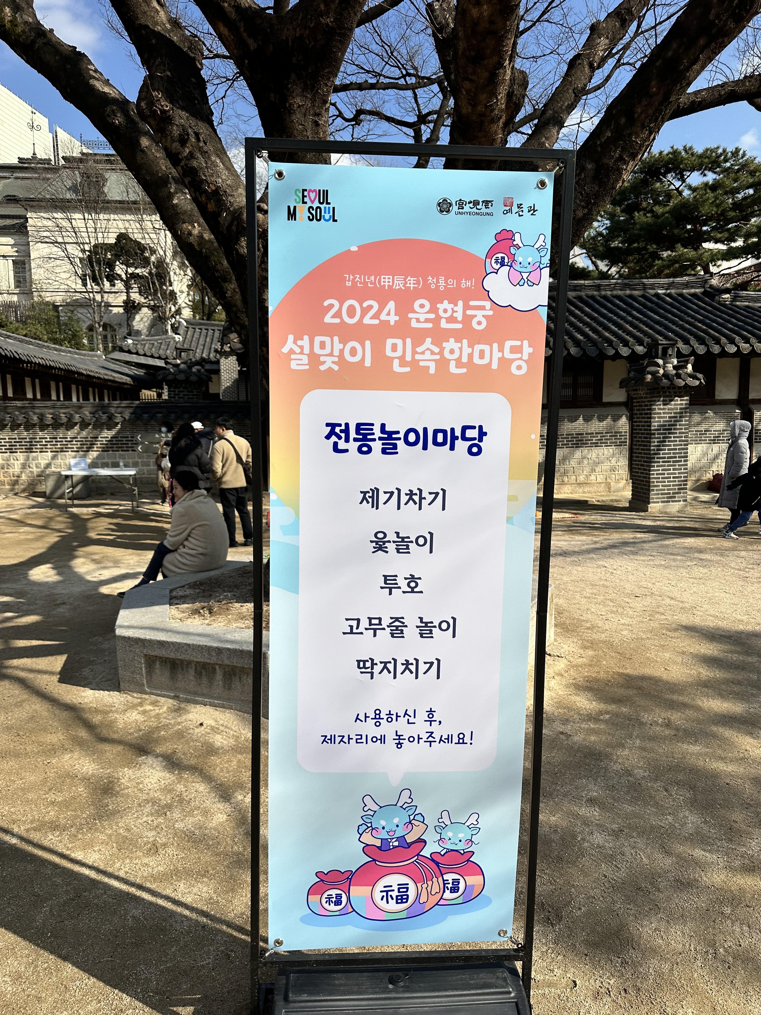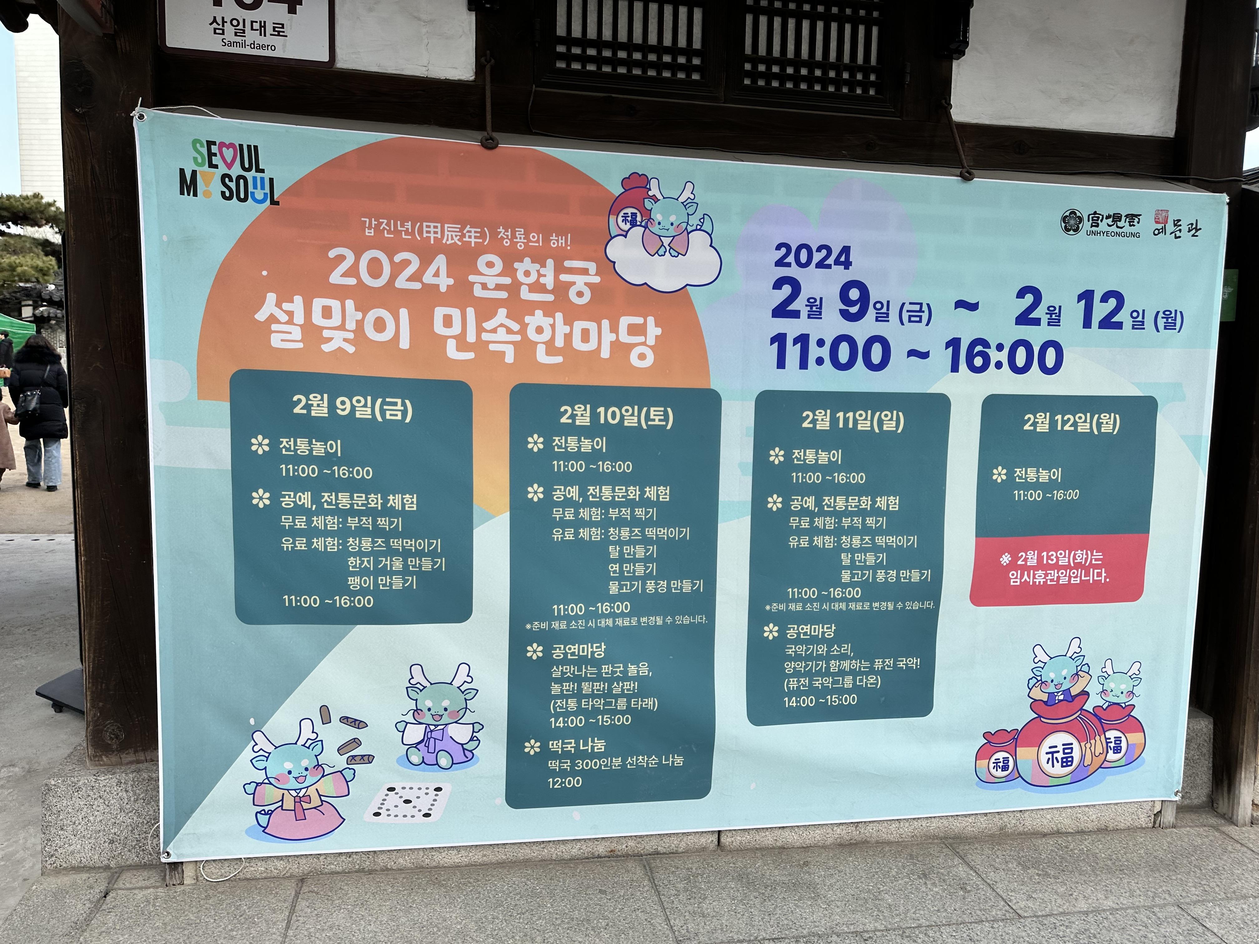 2024년 운현궁은 설맞이 민속한마당을 2월9일 금요일부터 2월 12일 월요일까지 진행을 합니다. 각 요일별로 다양한 전통문화체험 프로그램이 있습니다. 아이들과 함께 할 수 있는 공연과 전통문화 체험이 있어서 설날에 찾아가기 좋은 곳입니다.