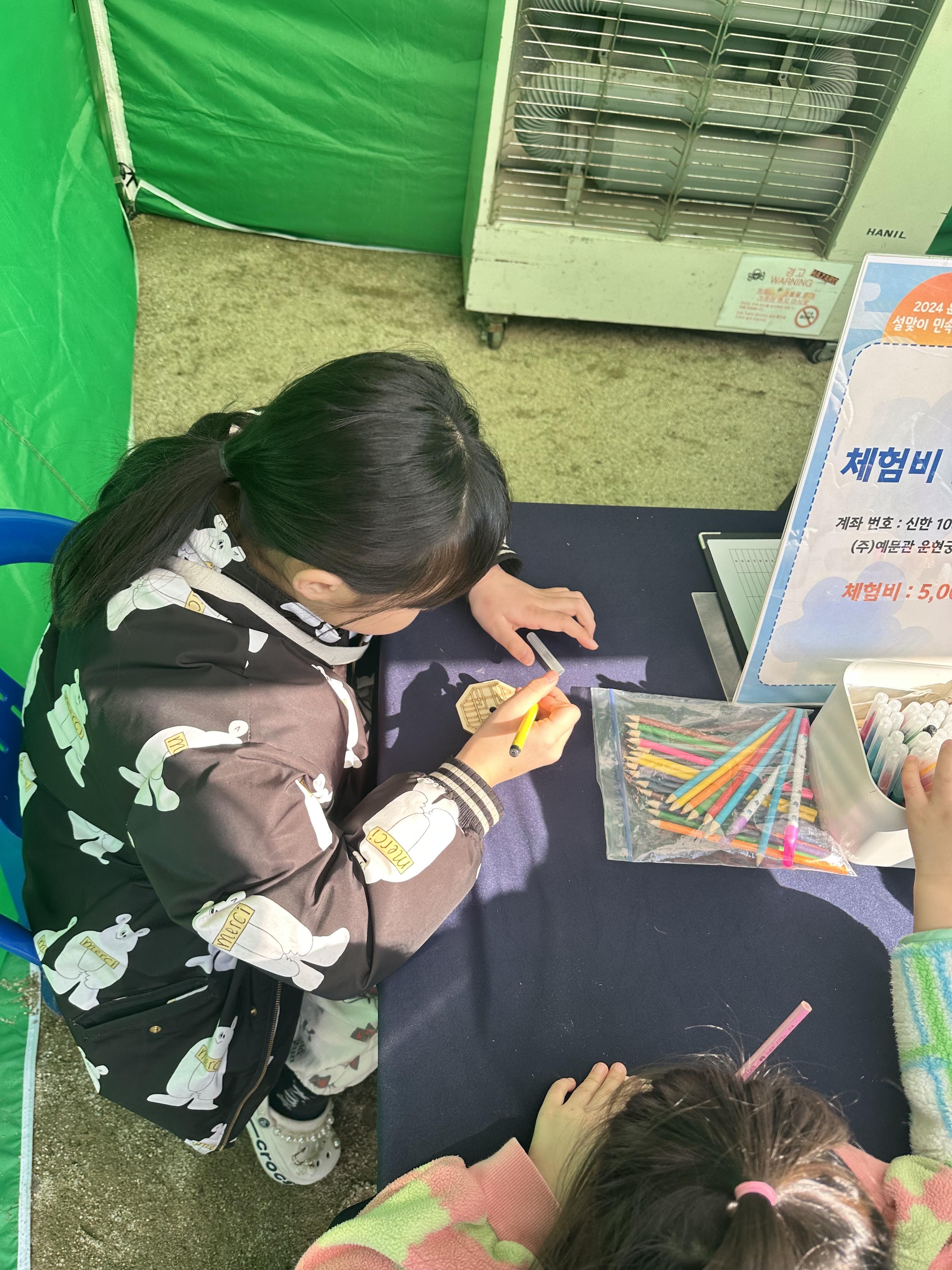 체험부스 중에서 가장 인기가 많았던 곳은 팽이 만들기였습니다. 체험비용도 있었지만 아이들이 가장 많았습니다. 팽이는 남녀노소 가지고 놀 수 있는 좋은 전통놀이여서 딸의 체험을 독려했습니다.