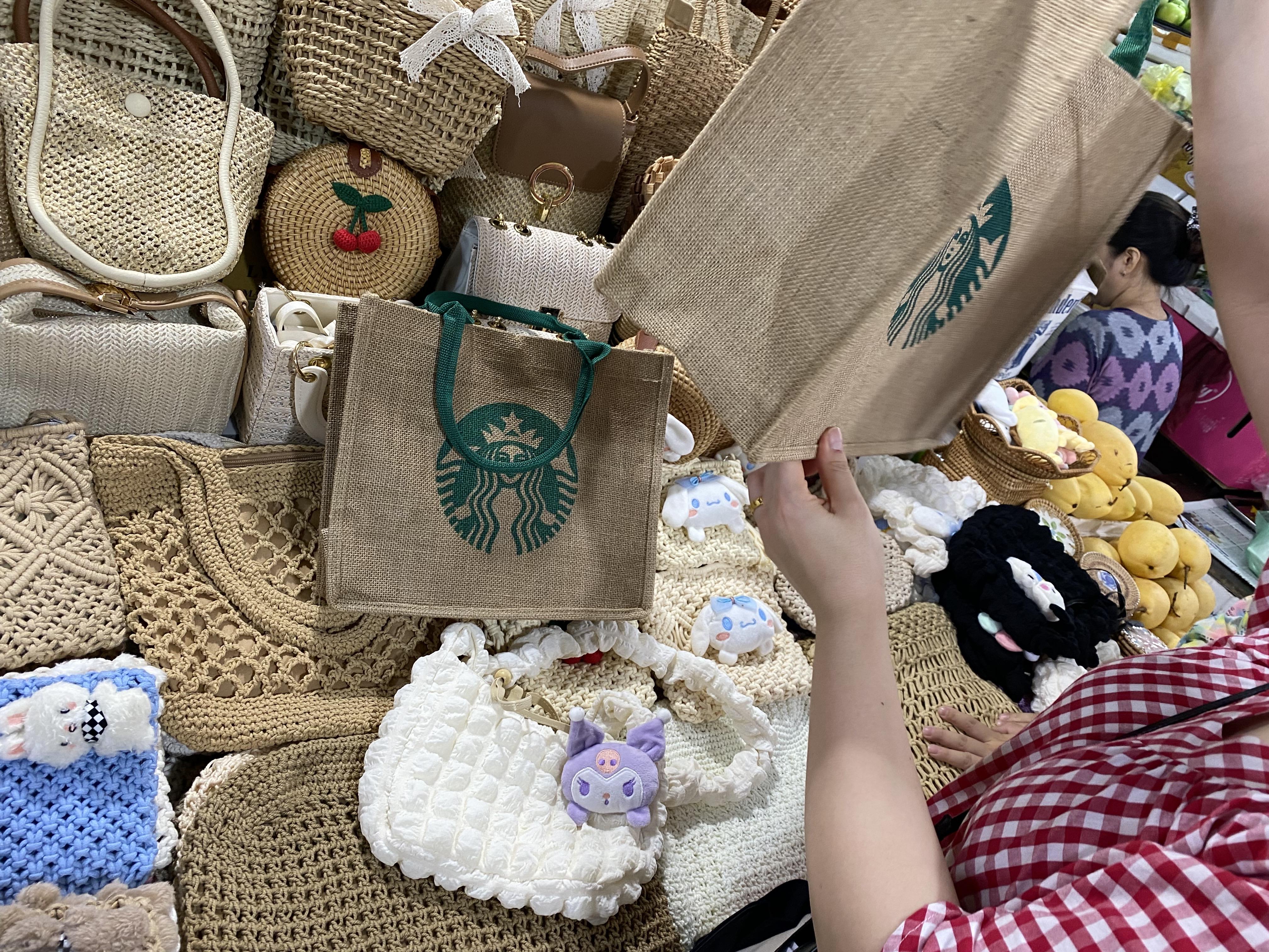 한시장 가방은 1층에 위치해 있어서 아이들이 좋아할 만한 가방이 많이 전시되어 있습니다. 선물용으로 스타벅스 가방도 있는데 한화로 약 3,000원밖에 안 해서 부담 없이 살 수 있습니다. 퀄리티도 나쁘지 않아서 많이 사가는 품목 중 하나입니다.