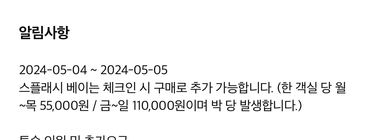 요금결제는 숙박 결제 시 패키지로 구매 혹은 체크인 시 추가로 구매가 가능합니다. 구매요금은 객실 당 비용을 정산하여 계산합니다.