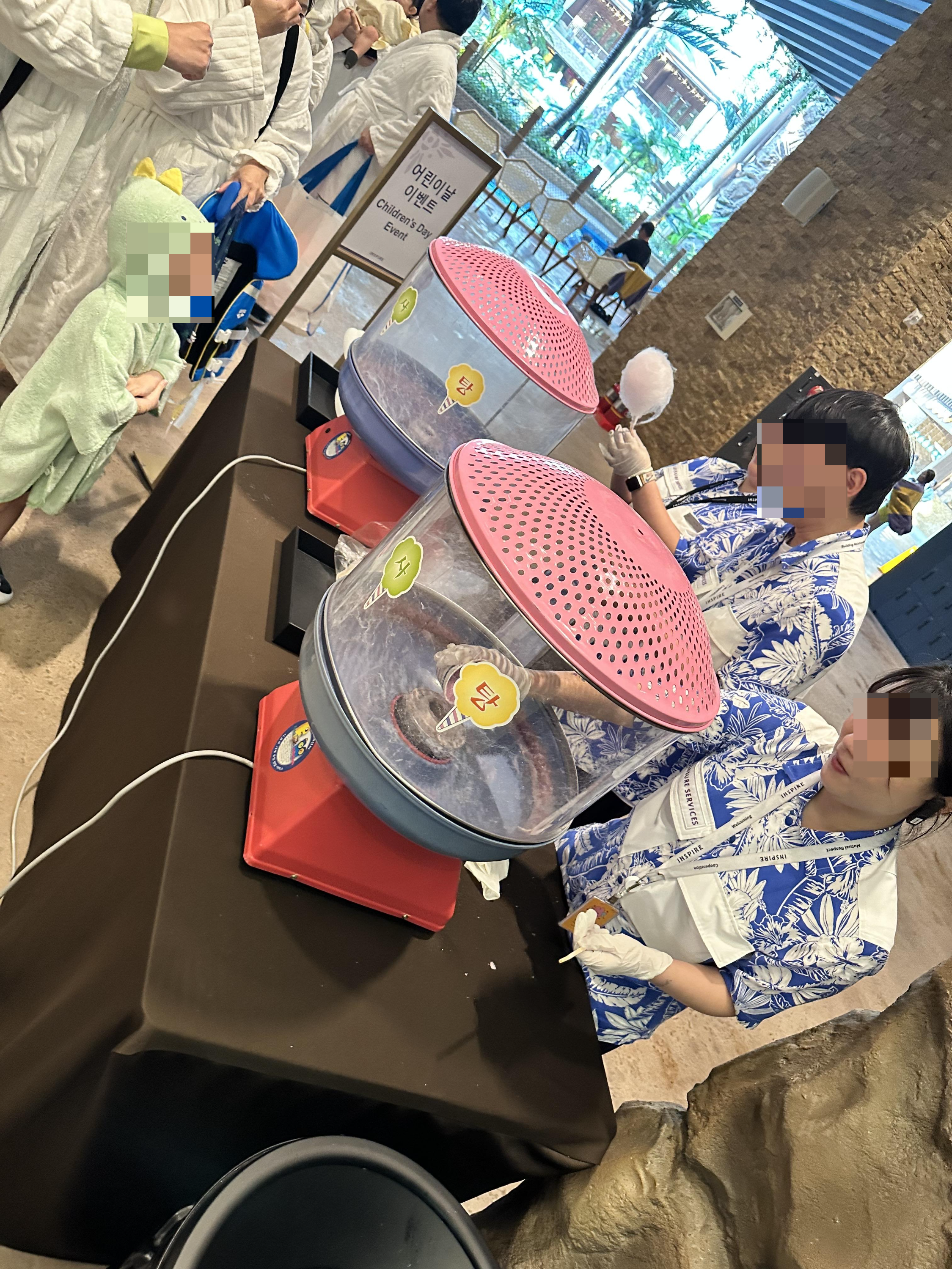 어린이날 방문을 해서 그런지 입구에서 아이들에게 솜사탕을 주는 행사를 하고 있었습니다. 저렇게 다 가운을 입고 객실로 이동을 합니다.