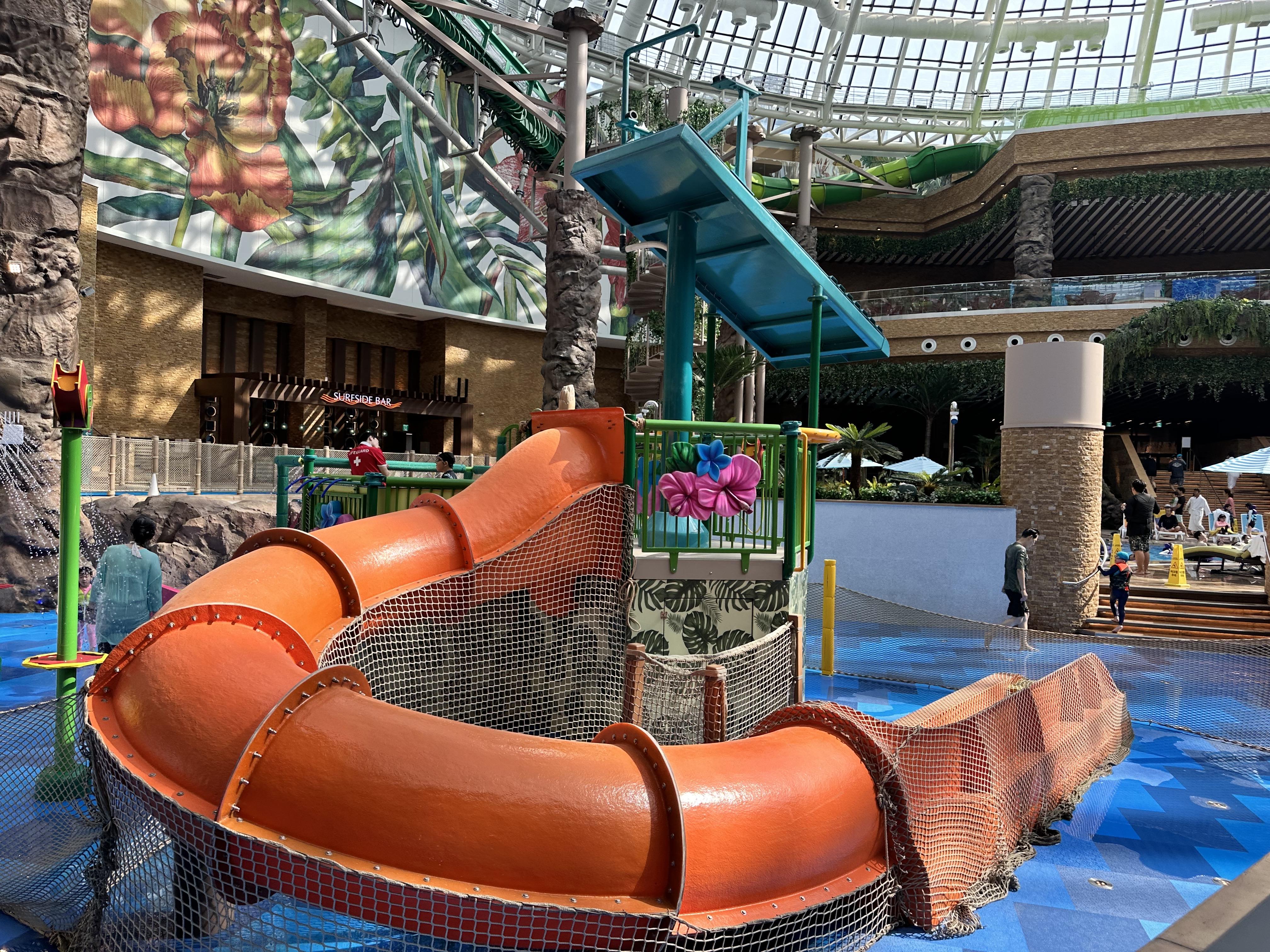 스플래쉬 베이는 유리 돔 위로 보이는 것이 특징이며, 판타지 동화 같은 컨셉으로 수영장이 만들어졌습니다.