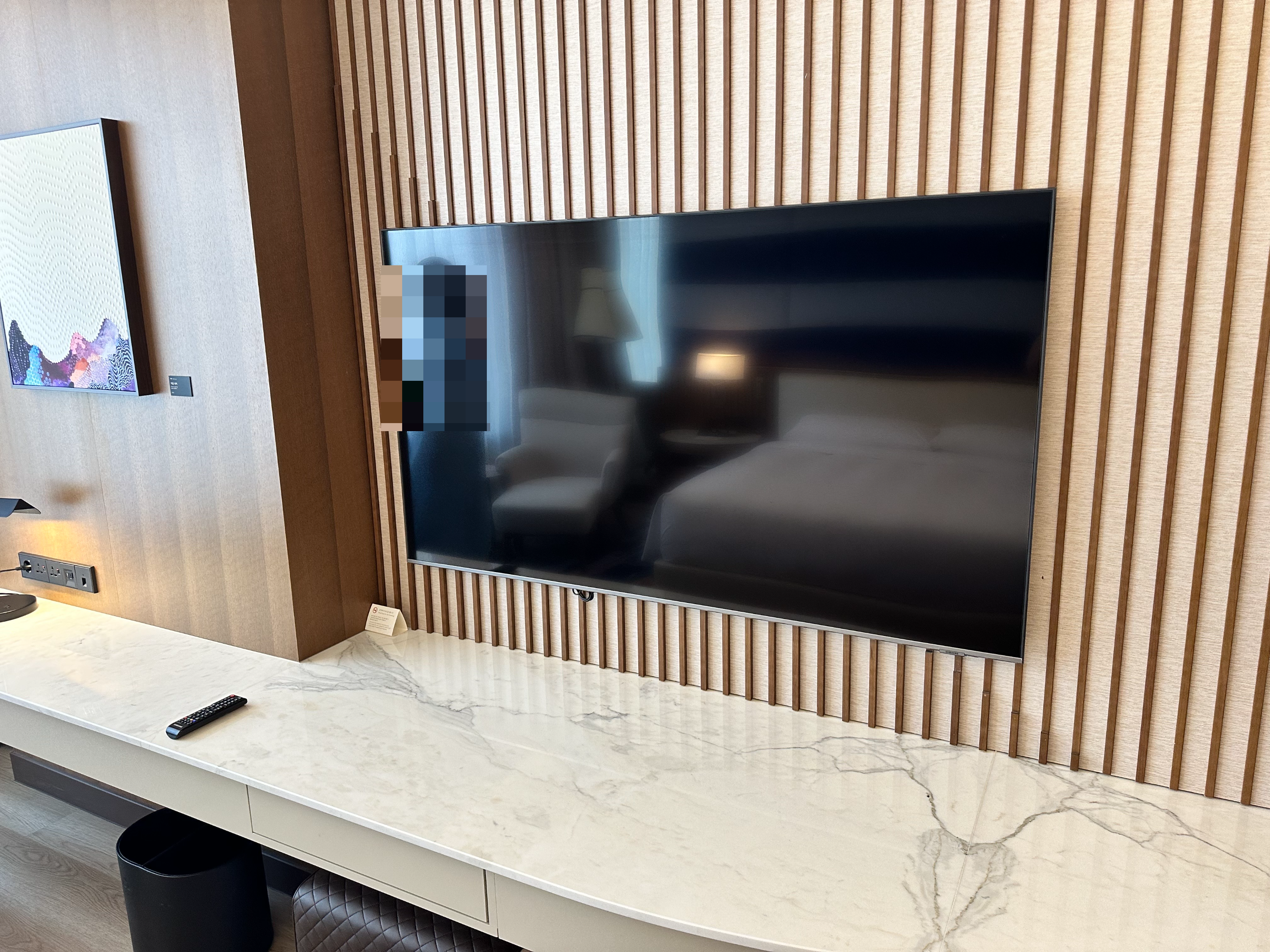 옷장 안에는 가운 하나가 있는데 욕실에 하나가 더 있어서 2개가 비치되어 있습니다. 그리고 안에는 금고와 슬리퍼, 다리미가 비치되어 있습니다. 태블릿으로는 전등과 주차등록을 제어할 수 있습니다.