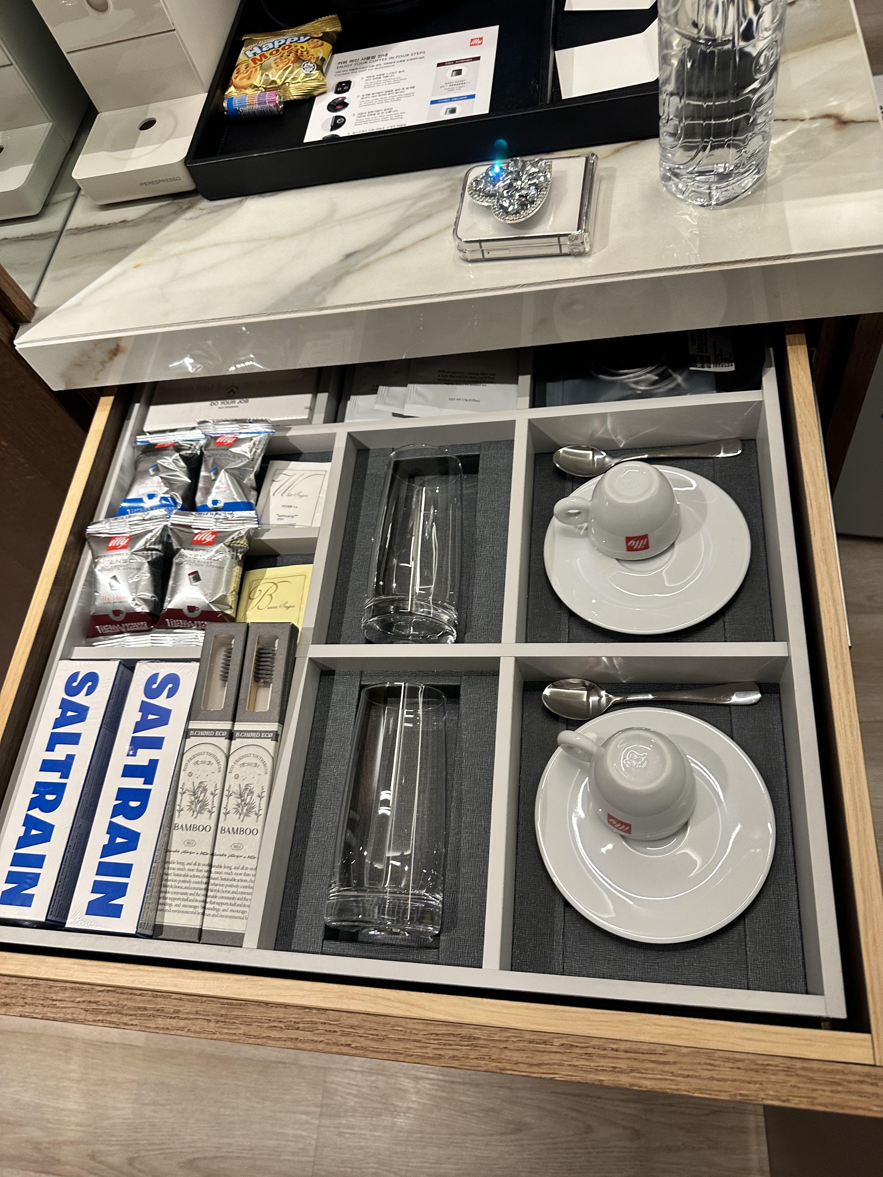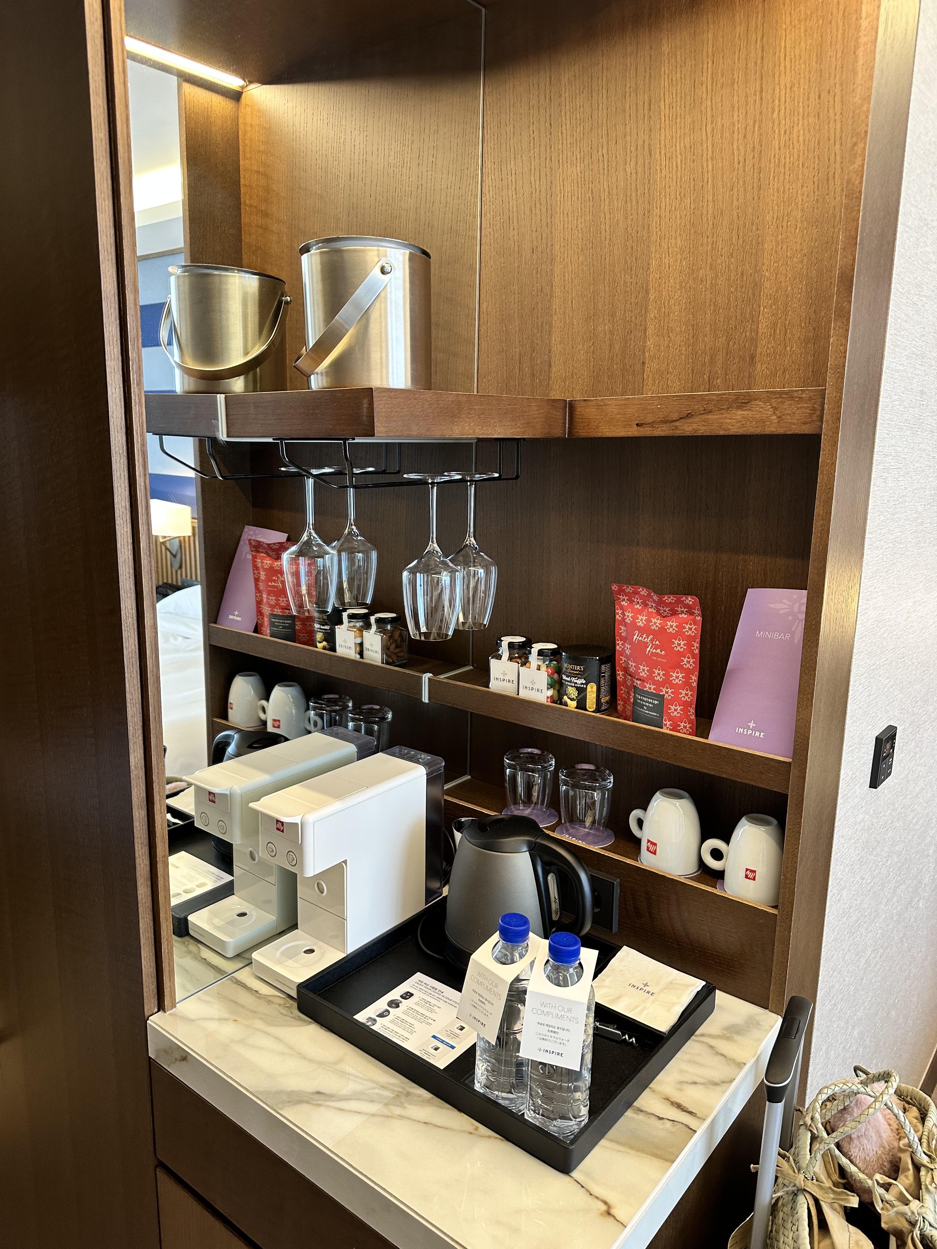 미니바에는 생수 2병과 커피 4개, 티백은 무료이며, 나머지는 유료입니다. 커피머신으로 커피를 먹을 수 있어서 편하고 좋더라고요.
