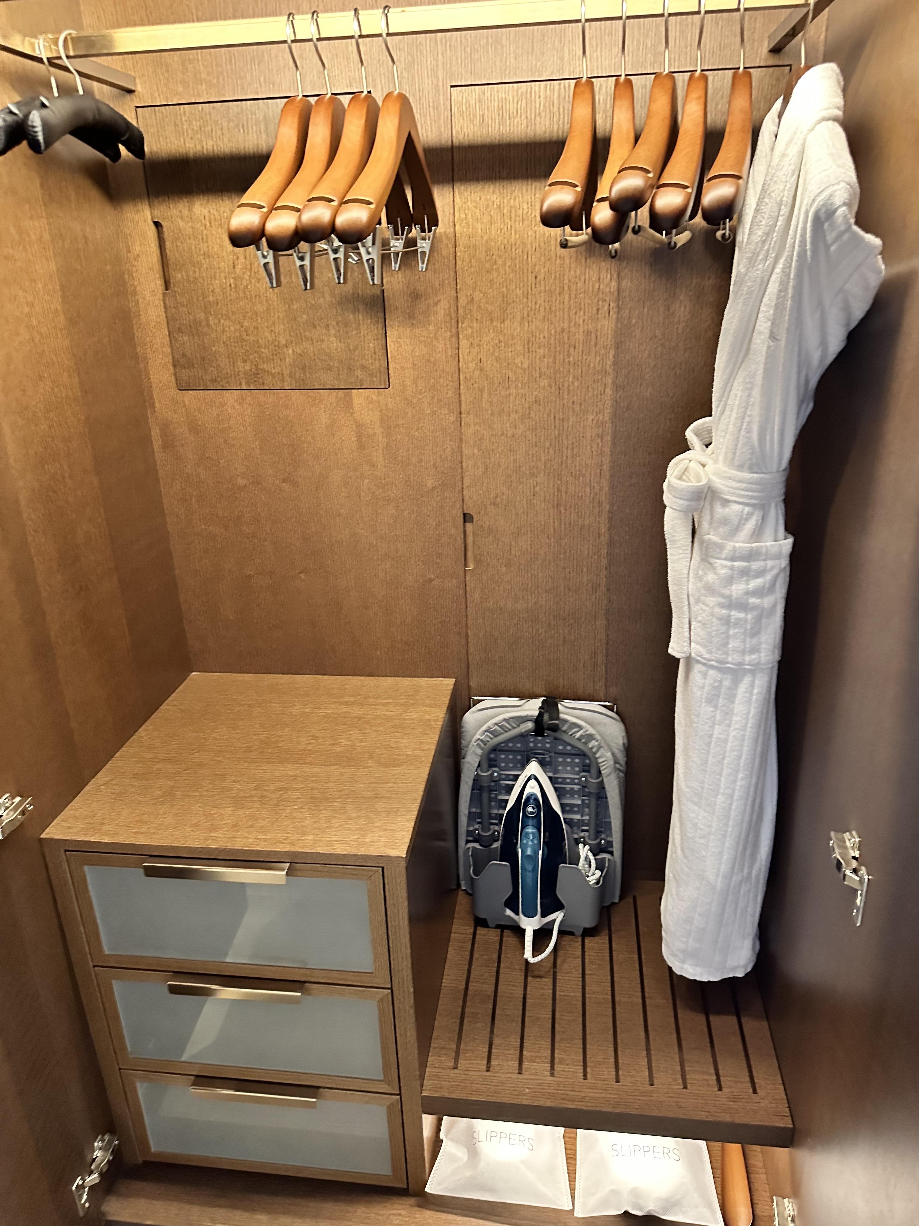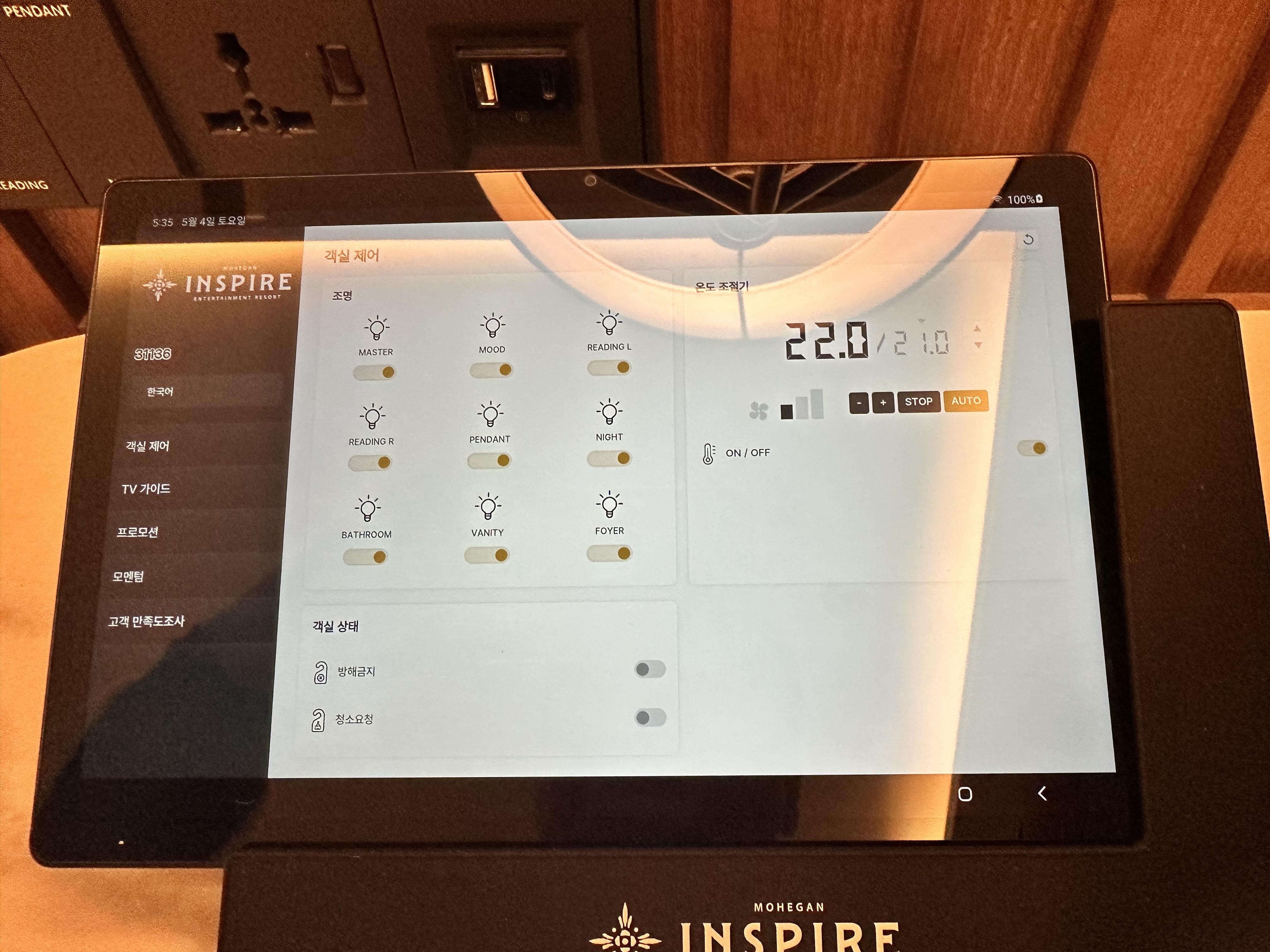옷장 안에는 가운 하나가 있는데 욕실에 하나가 더 있어서 2개가 비치되어 있습니다. 그리고 안에는 금고와 슬리퍼, 다리미가 비치되어 있습니다. 태블릿으로는 전등과 주차등록을 제어할 수 있습니다.