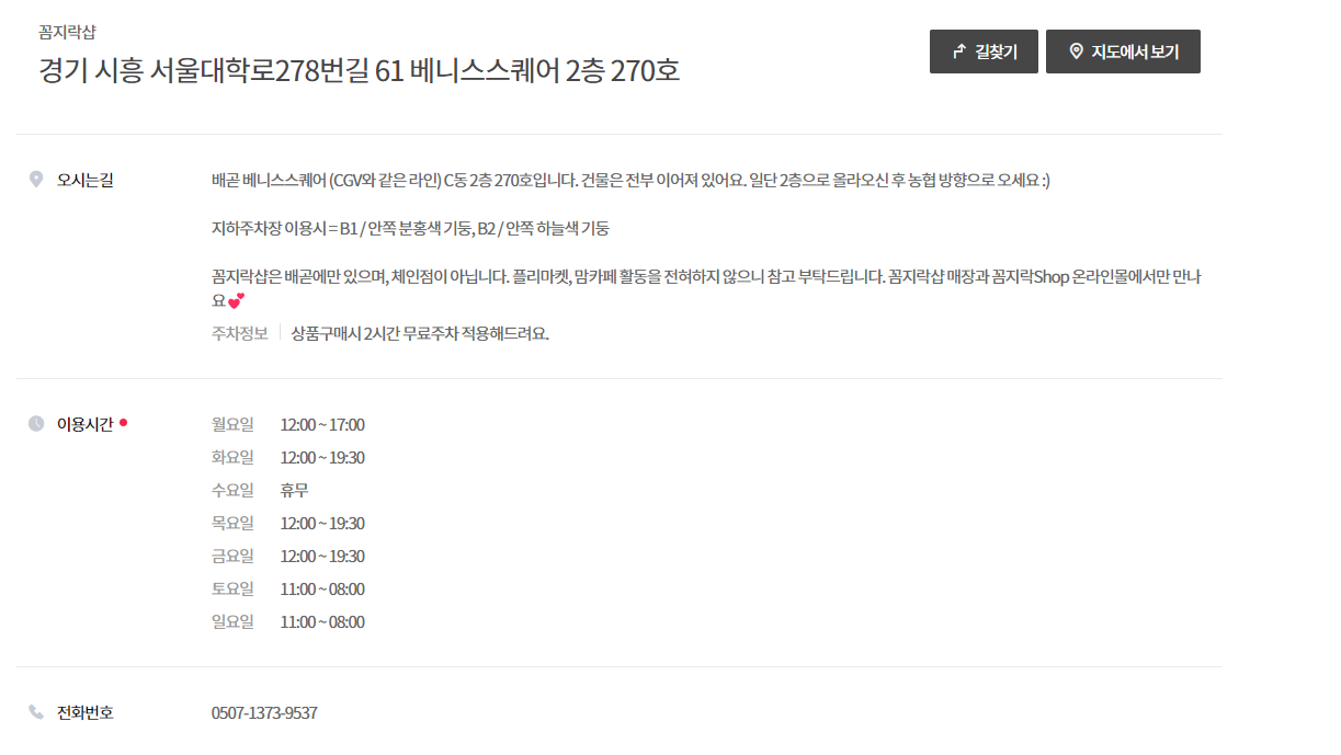 꼼지락샵은 평일 12~19:30분, 주말은 11~20시이며, 매주 수요일 휴무입니다.