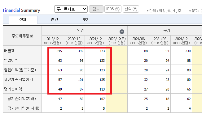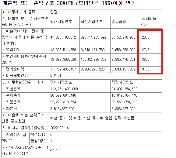 2021년 실적을 보면선 전년대비 매출액, 영업이익, 당기순이익이