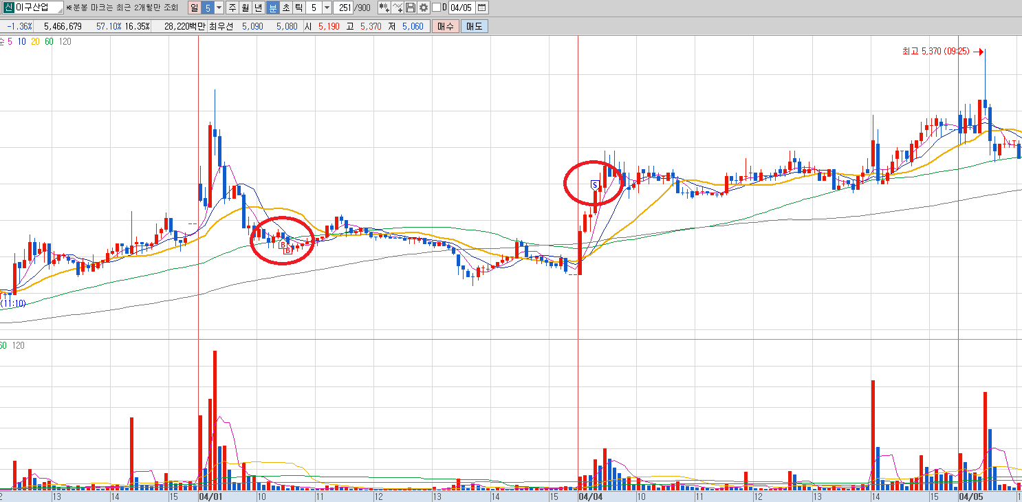 이구산업의 타점은 장 초반에 거래대금과 함께 상승 후 시가를 깨는 모습을 보여서