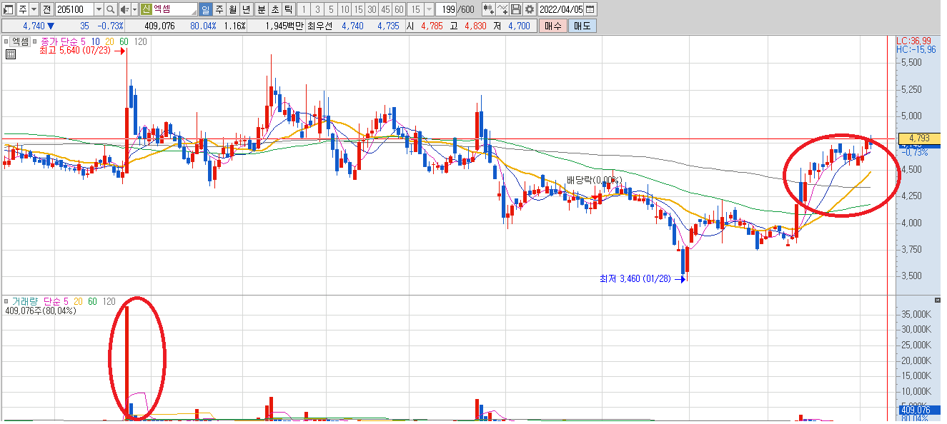 엑셈의 일봉 차트를 보시면 작년 7월에 거래대금과 함께 상승을 해주고