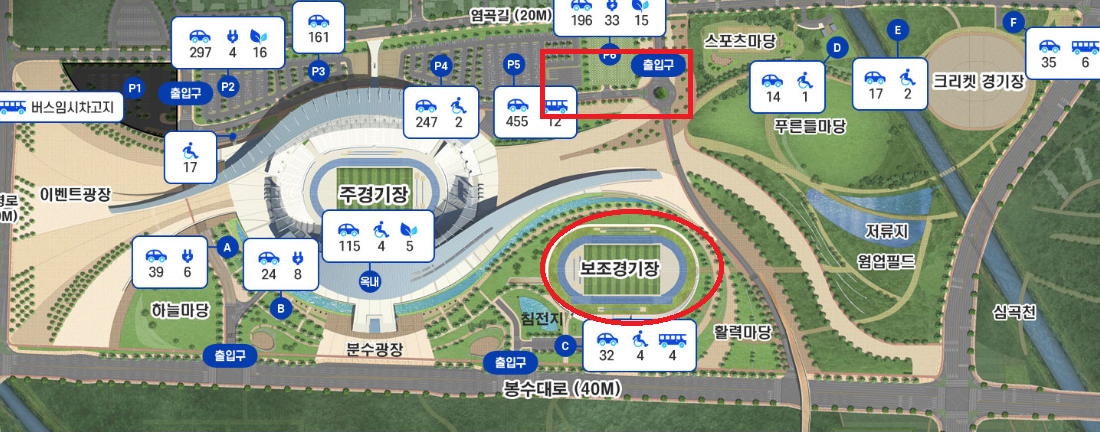 처음에 주차장이 어디 있는지 몰라서 헤맸던 기억이 있습니다. 아시아드 보조경기장 러닝 트랙을 이용하기 위해서는 빨간색 네모 표시에 부근에 주차를 하시고 걸어오셔야 합니다. 아시아드 경기장은 넓어서 주차하기가 정말 편합니다.