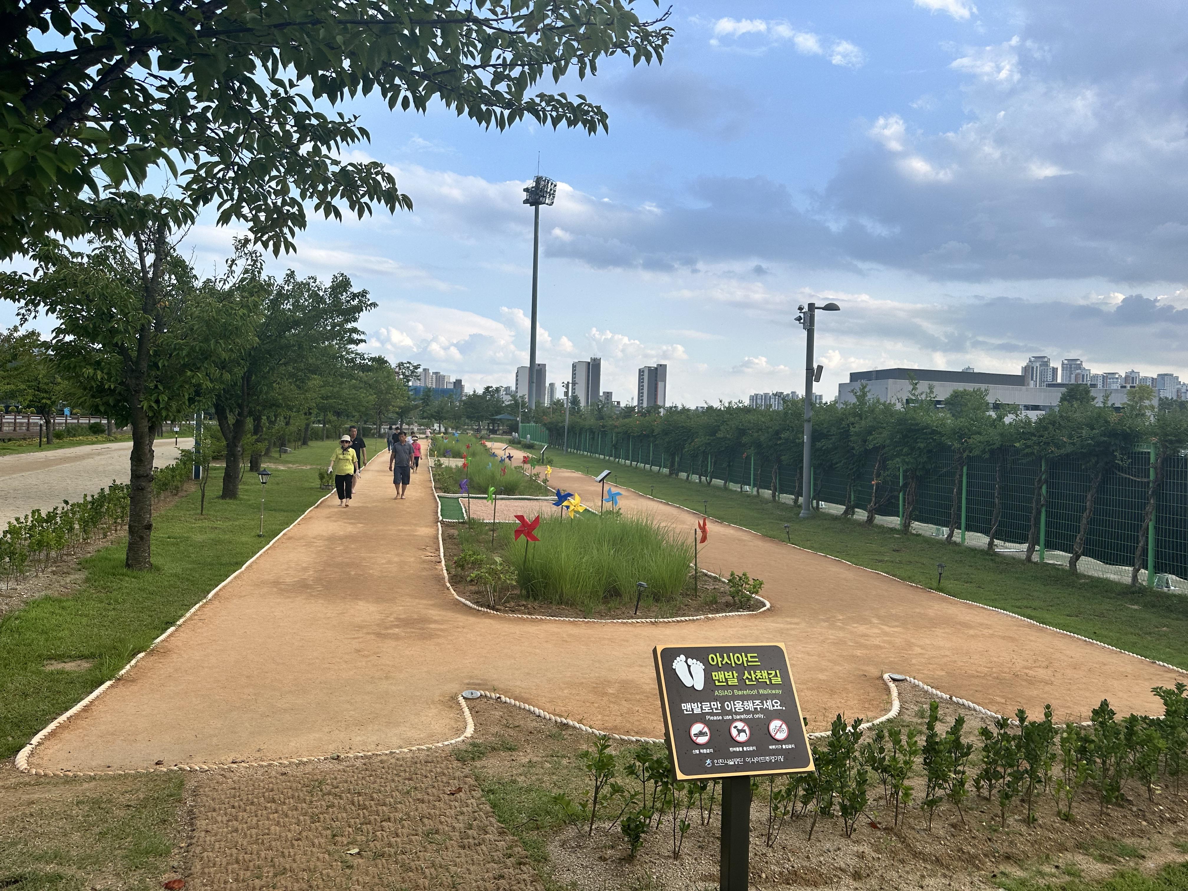 러닝트랙 가기 전에 맨발 산책길이 있습니다. 흙과 모래로 맨발로 산책하기 좋은 곳입니다. 특히 어르신들이 정말 많이 이용을 하고 있는 곳입니다. 이곳에는 애견 동반 불가하며, 신발을 신고 이용이 불가한 곳입니다.
