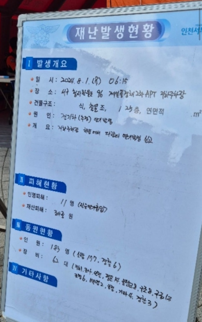 인천 청라 제일풍경채2차 지하주차장 전기차 화재 발생
