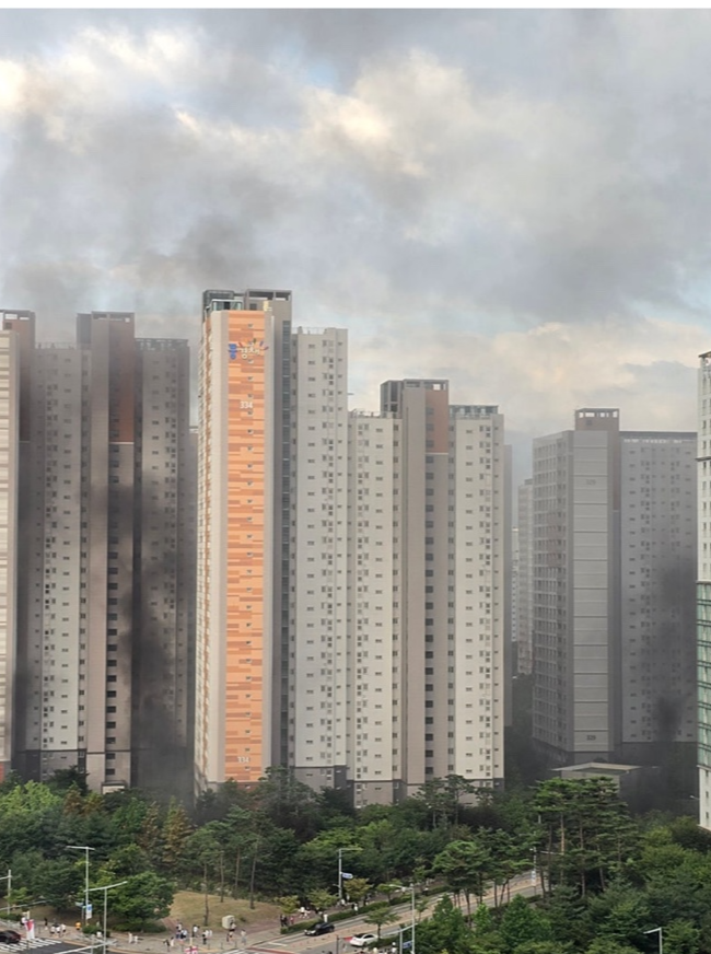 청라 제일 풍경채 화재는 멀리서도 보일정도로 검은연기가 발생하고 있습니다. 밑에 지하주차장에서 올라오는 화재연기사진입니다.