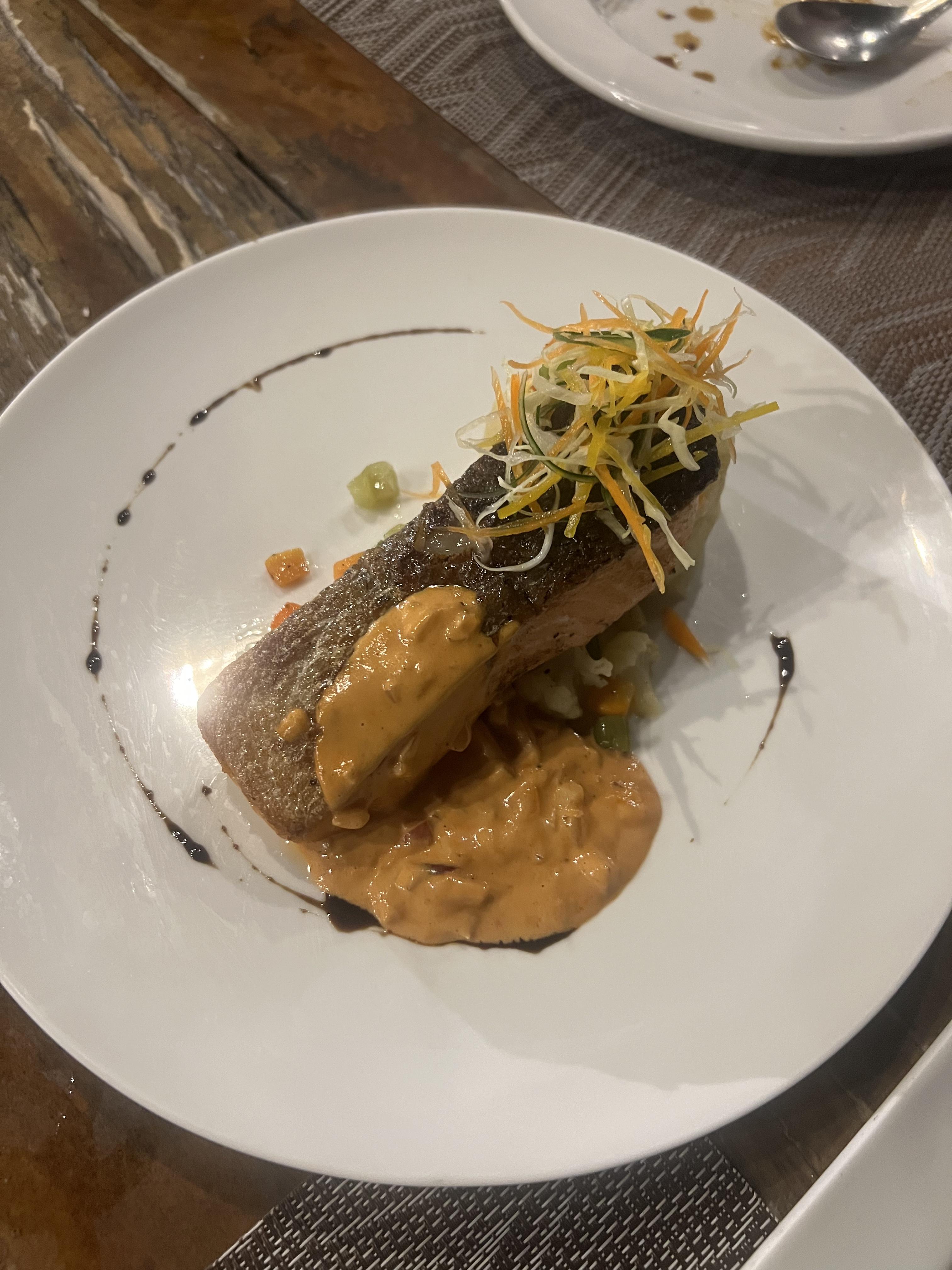그릴에 구운 노르웨이산 연어를 새우 벨루테 소스를 넣어서 만든 요리입니다. 연어와 소스가 정말 잘 어우러져서 맛있습니다. 연어 좋아하시는 분들한테는 강력 추천하는 메뉴입니다.
