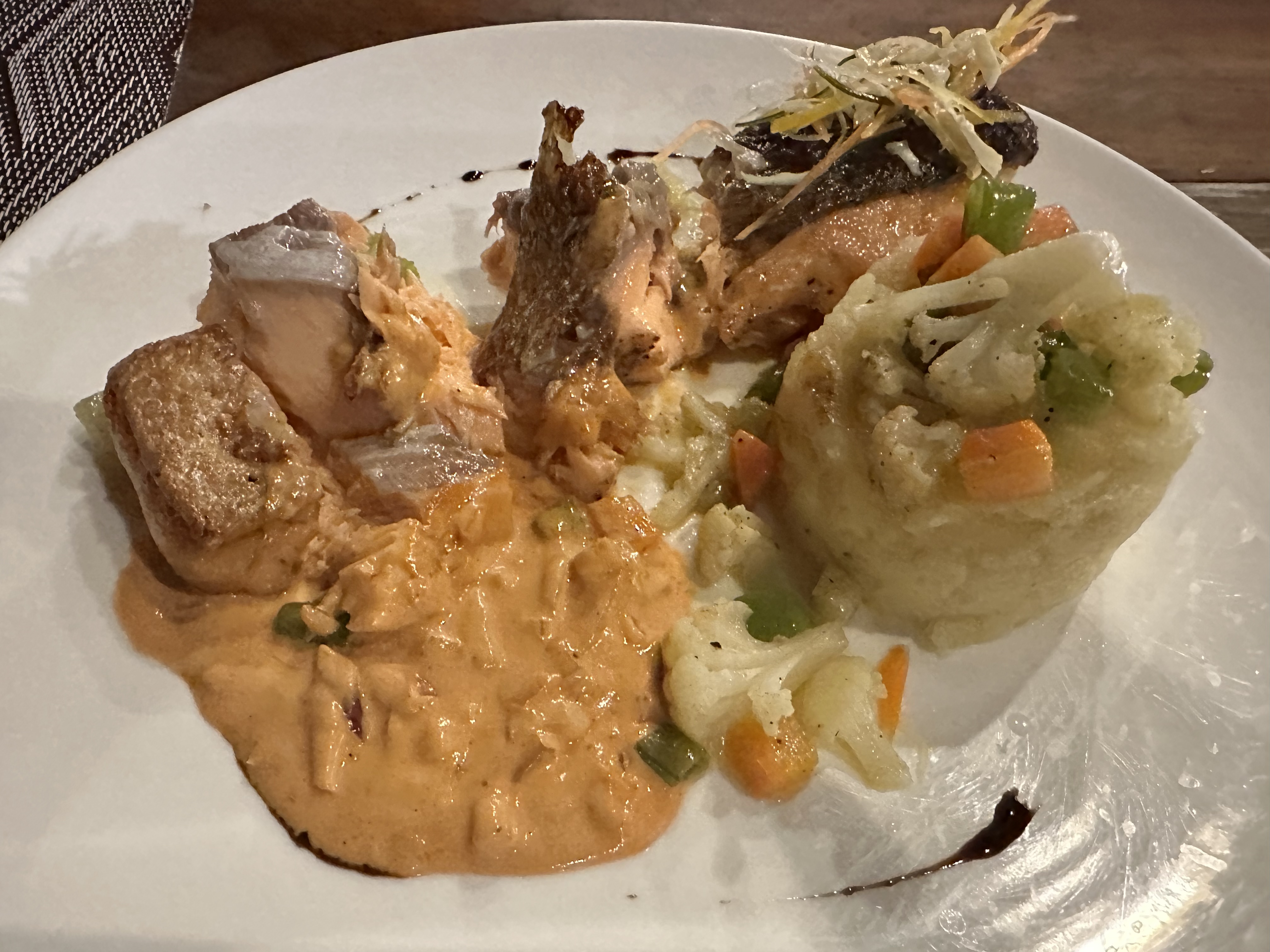 그릴에 구운 노르웨이산 연어를 새우 벨루테 소스를 넣어서 만든 요리입니다. 연어와 소스가 정말 잘 어우러져서 맛있습니다. 연어 좋아하시는 분들한테는 강력 추천하는 메뉴입니다.