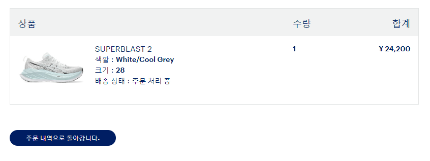 현재는 슈퍼블라스트2 화이트/쿨그레이 일부 사이즈를 제외하고는 품절된 상태입니다. 제가 10시 바로 주문을 해서 구매를 할 수 있었지만 약 1시간 만에 품절이 된 상태입니다. 일본에서도 인기가 많은 거 같습니다. 특히 일본 아식스는 1계 정당 1족만 구매가 가능한 시스템이어서 리셀러들이 대량으로 구매하지는 못합니다.