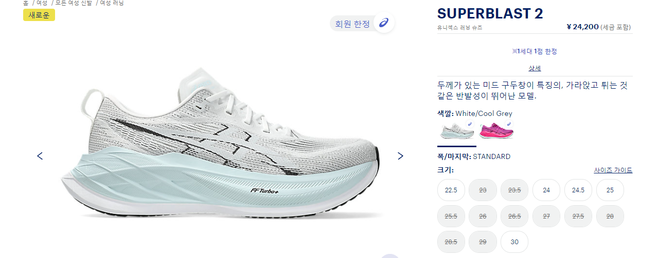 현재는 슈퍼블라스트2 화이트/쿨그레이 일부 사이즈를 제외하고는 품절된 상태입니다. 제가 10시 바로 주문을 해서 구매를 할 수 있었지만 약 1시간 만에 품절이 된 상태입니다. 일본에서도 인기가 많은 거 같습니다. 특히 일본 아식스는 1계 정당 1족만 구매가 가능한 시스템이어서 리셀러들이 대량으로 구매하지는 못합니다.