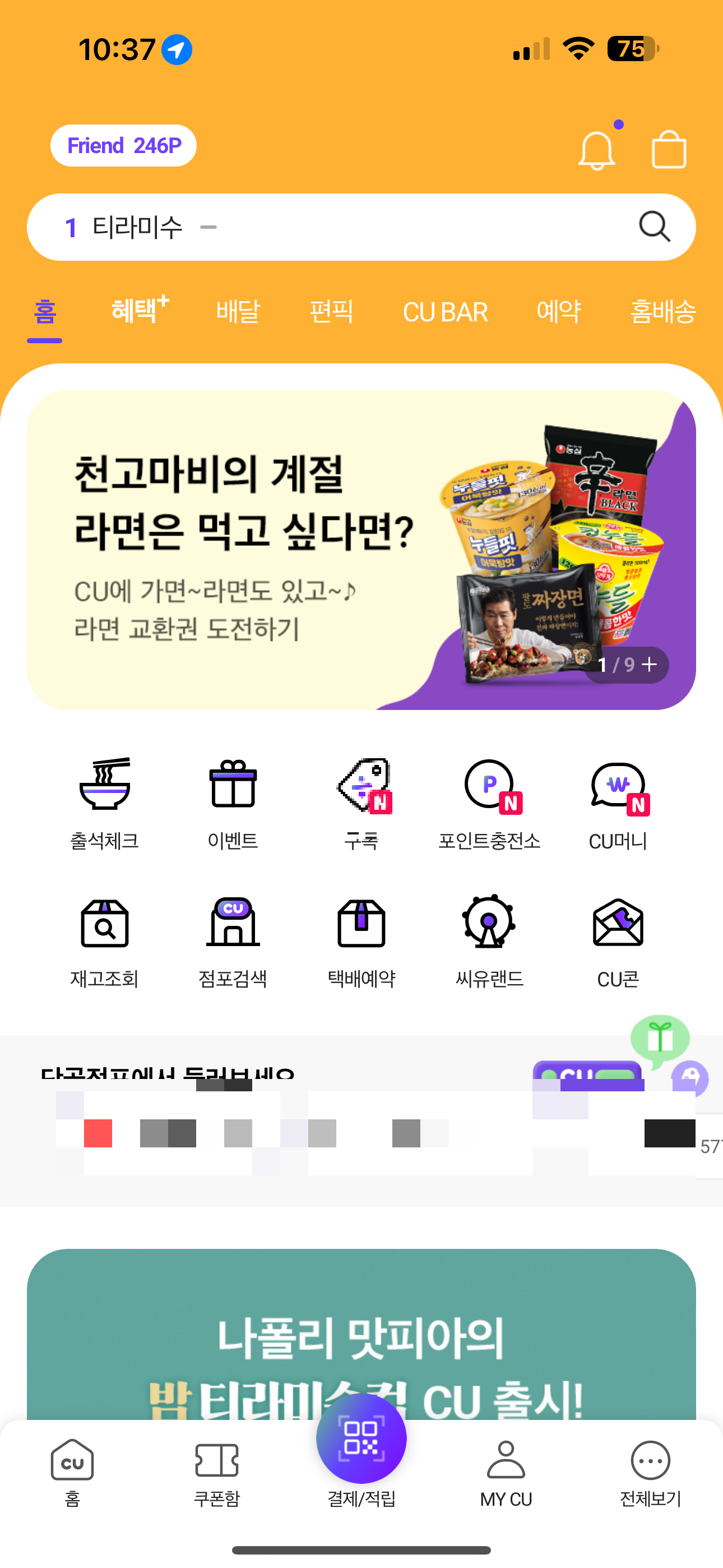 사전예약후 포켓 CU에서 지정된 날짜에 픽업이 가능하면 지정된 CU에 입고가 되면 개별 카톡이 옵니다. 그럼 그때 편의점에 가서 포켓 CU 어플에 있는 QR코드를 보여주고 픽업을 하면 됩니다. 편의점 안에 입고된 밤티라미수는 저렇게 "임자 있음"이라고 붙어 있습니다.