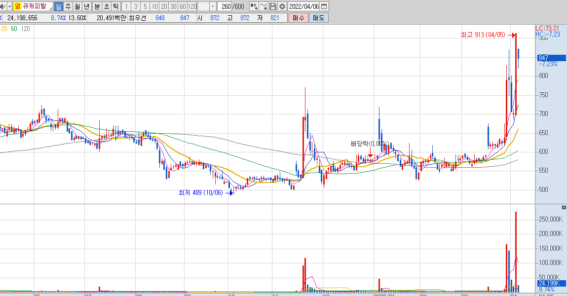 큐캐피탈도 다른 기업의 인수소식에 다시 하락하고 있는 모습을 보여주고 있습니다.