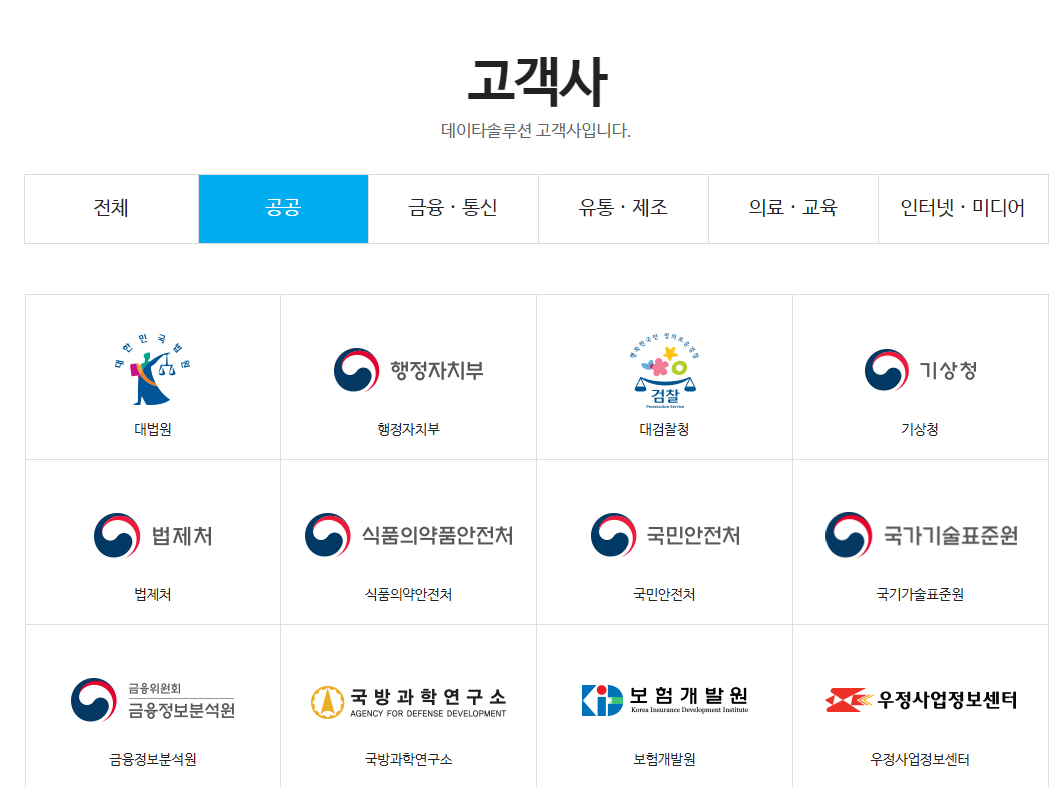 현재 데이타솔루션의 고객사로는 대법원, 행정자치부, 대검찰청, 기상청, 법제처,