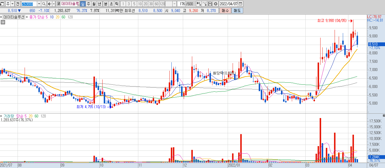 데이타솔루션의 일봉 차트를 보면 상승추세의 파동을 만들어 가고 있으며