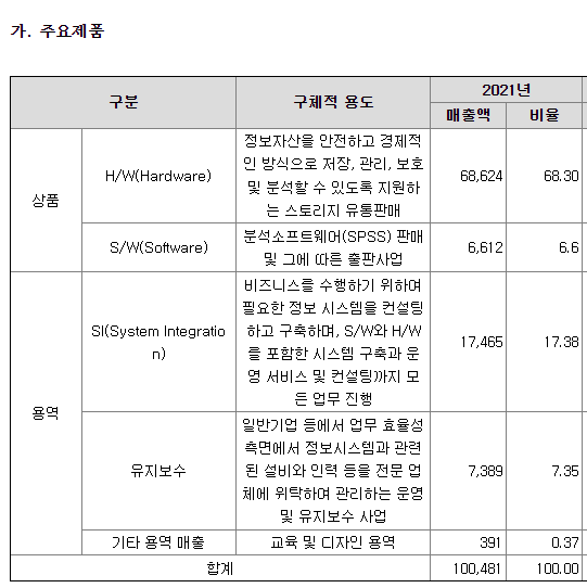 주요 제품 중 HARDWARE는 전체 비율 중 68%를 차지하고 있는 만큼 큰 비중에 해당하고 있습니다.