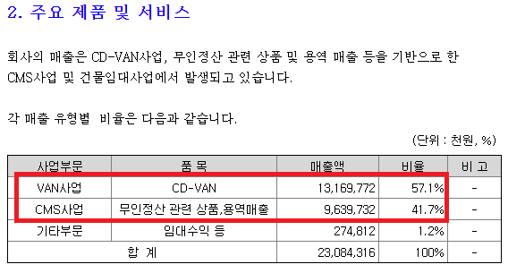 주요 제품은 VAN 사업과 CMS 사업으로 매출을 발생되고 있는 상황입니다.