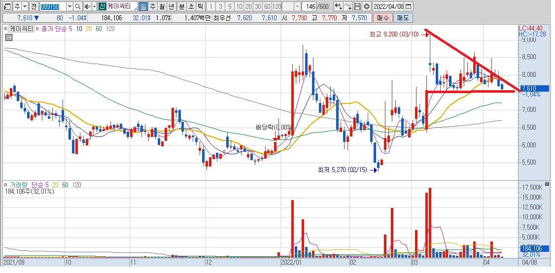 케이씨티 차트를 보시면 고점이 낮아지는 삼각 차트를 만들어가는 모습을