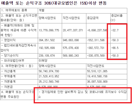 주요 원인으로는 경기침제로 인한 설비투자 감소 및 코로나19로 유지보수 수익이 감소되었다고